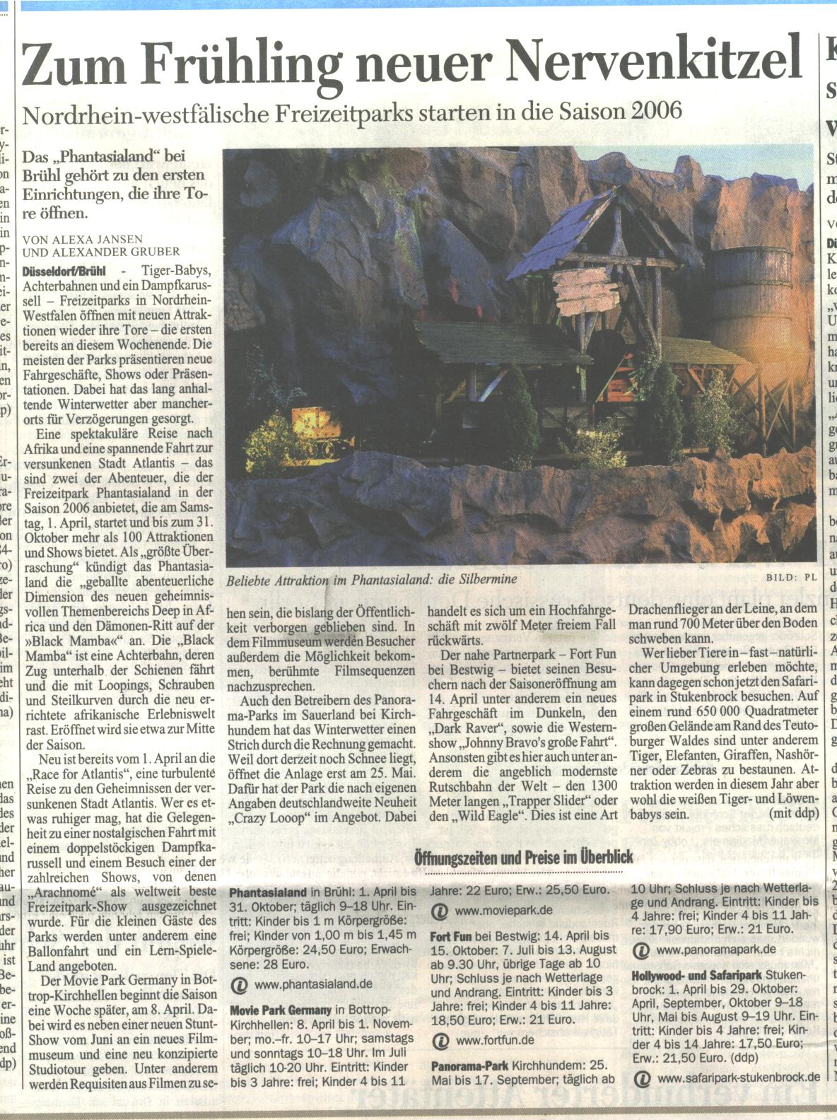 Eine spektakuläre Reise nach Afrika und eine spannende Fahrt zur versunkenen Stadt Atlantis - das sind zwei der Abenteuer, die der Freizeitpark Phantasialand in der Saison 2006 anbietet, die am Samstag, 1. April, startet und bis zum 31. Oktober mehr als 100 Attraktionen und Shows bietet. Als „größte Überraschung“ kündigt das Phantasialand die „geballte abenteuerliche Dimension des neuen geheimnisvollen Themenbereichs Deep in Africa und den Dämonen-Ritt auf der »Black Mamba«“ an. Die „Black Mamba“ ist eine Achterbahn, deren Zug unterhalb der Schienen fährt und die mit Loopings, Schrauben und Steilkurven durch die neu errichtete afrikanische Erlebniswelt rast. Eröffnet wird sie etwa zur Mitte der Saison.