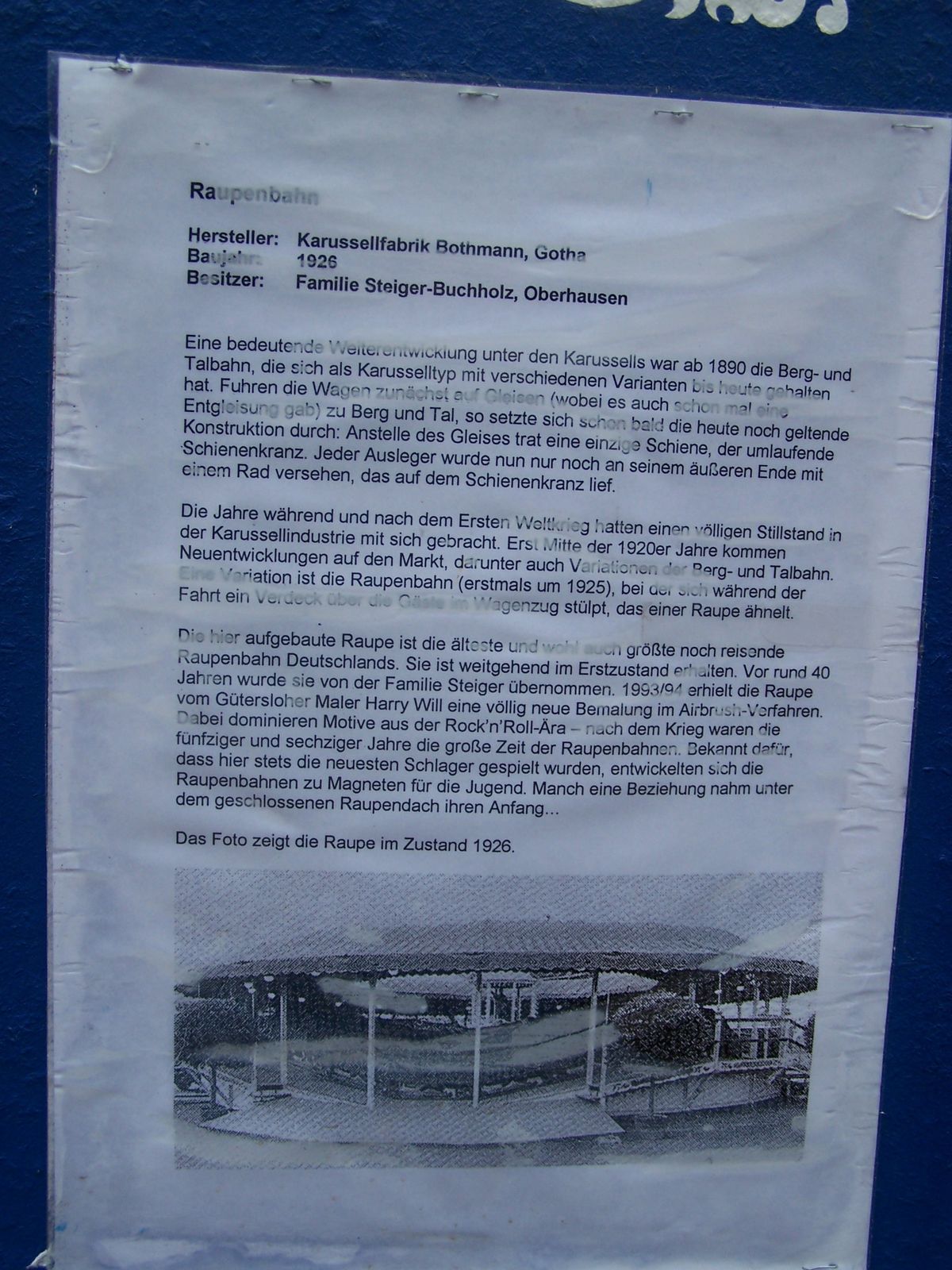 In den letzten Jahren war hier eine alte Raupenbahn, ein Kinderkarussell und ein altes Kettenkarussell mit Schwänen und normalen Sitzen zu finden. Manchmal steht dort auch ein richtig altes kleines "Riesenrad" und eine "Lachbude"?!