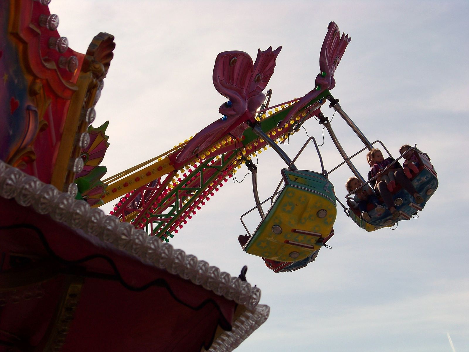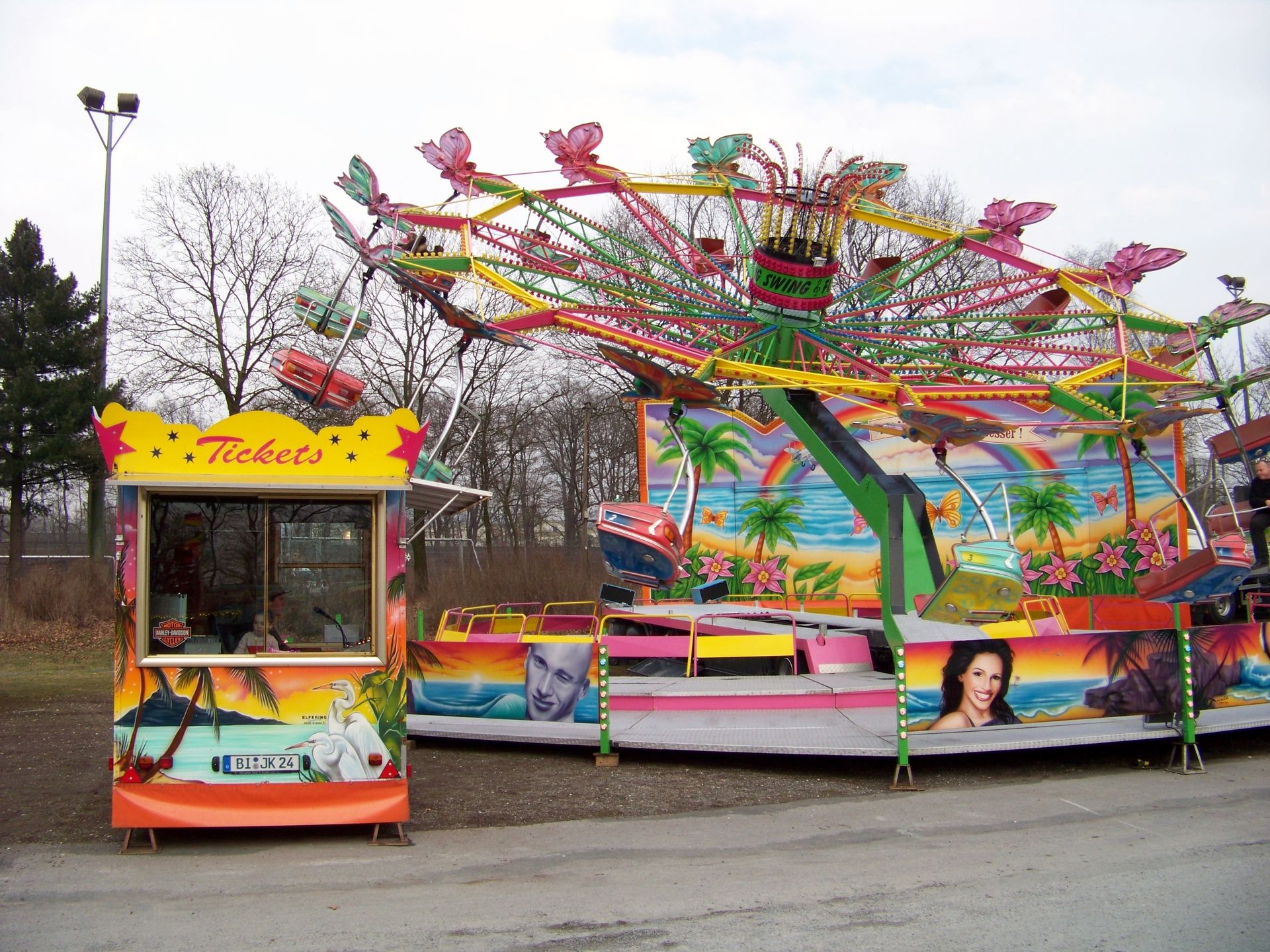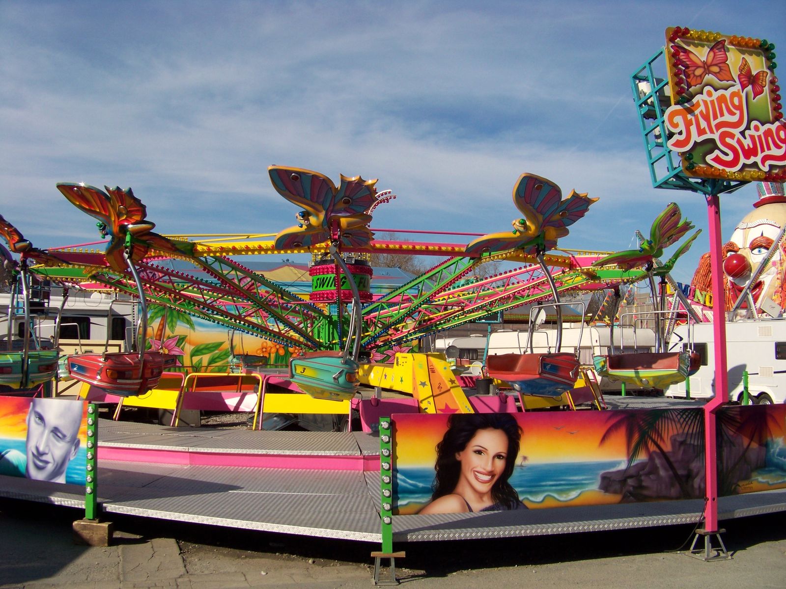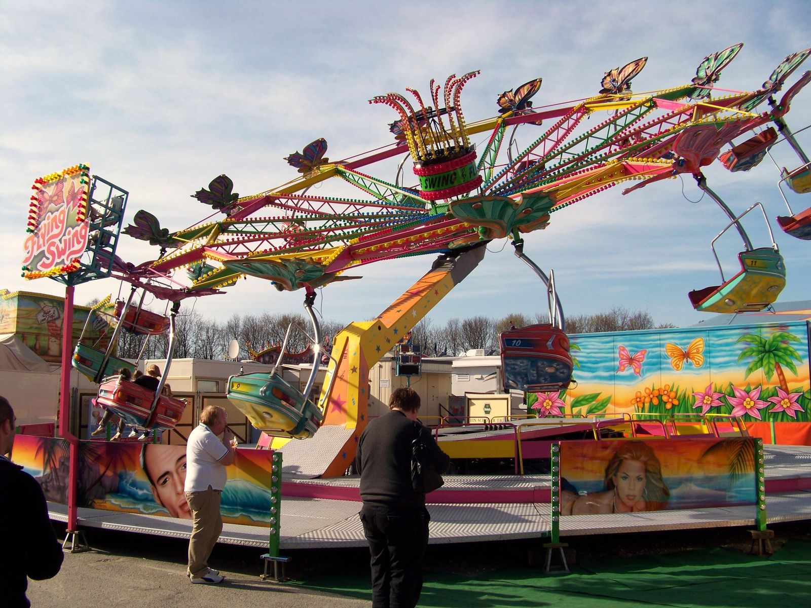 An den Lichtmasten steht der Name "Flying Swing", am Lichtkranz in der Karussellmitte steht "Flying Star"
