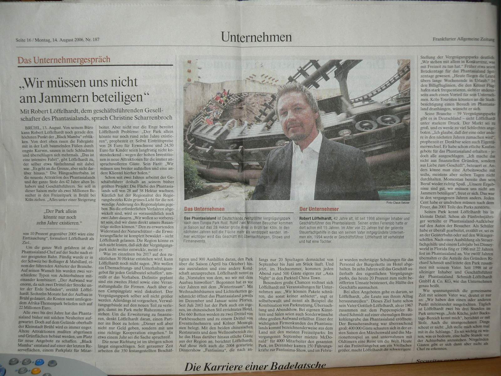 PS: Ich bin mal gespannt, wen er als Teilhaber in den Park aufnehmen will. Das muss dann aber jemand sein, der auch mit Liebe zum Park dabei ist und nicht nur irgendein Investor. So wie damals bei Schmidt und Löffelhardt sen. Jemand, der mit seinem ganzen Herzen beim Phantasialand ist und nicht nur auf jeden Cent schaut.