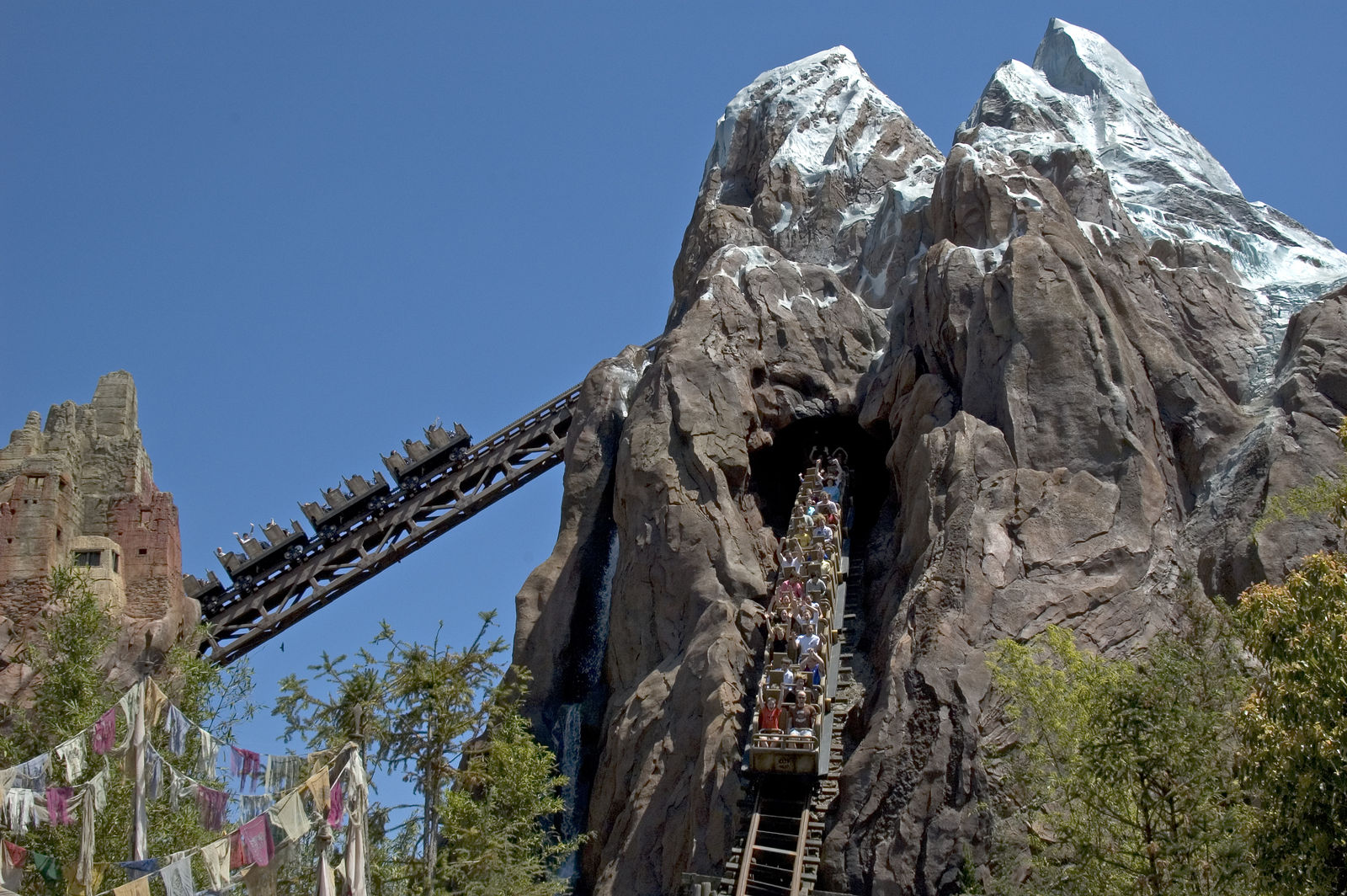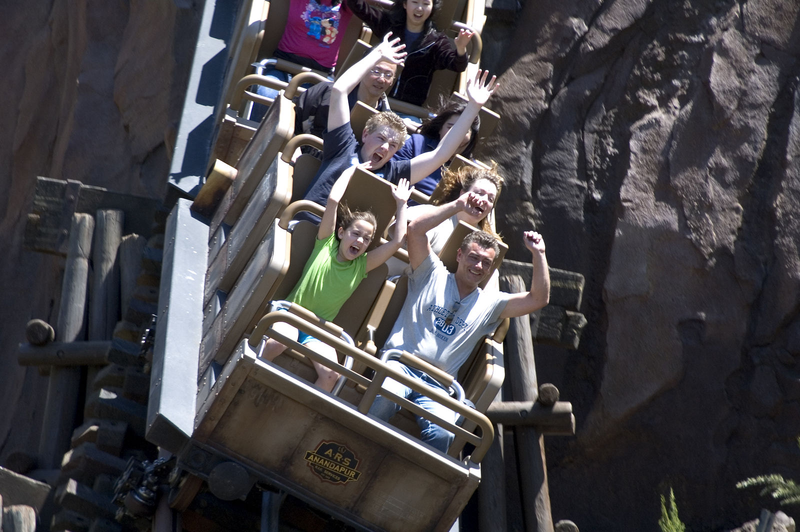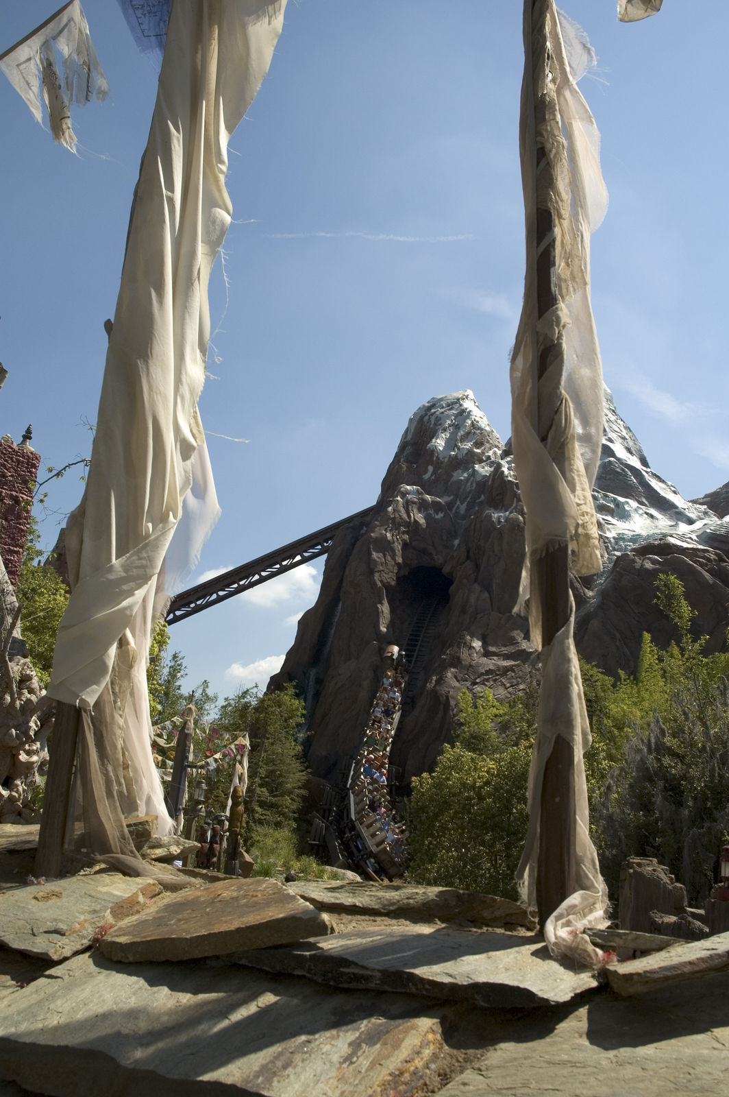 Als erstes kämpften wir uns durch die Menschenmassen hindurch in Richtung Asien. Schon von weiten konnte man den Berg der Neuheit „Expedition Everest“ sehen. Der Berg sieht Super aus, genau so wie die Warteschlange, die schon mit Zäunen erweitert wurde. Der Wartebereich wurde natürlich sehr schön gestaltet und man sammelt unterwegs ein paar Information über den Berg und den Yeti. Am Bahnhof angelangt hieß es erstmal Platz nehmen in den Dampf spuckenden Zug, der übrigens Klasse aussah. Hat man dann den großen Lifthill erreicht, sollte man die Aussicht genießen, den viel Zeit bleibt einen nicht mehr. Oben angekommen gerät der Zug ins stehen, die vor uns liegenden Schienen sind zerstört worden. Der Zug fährt nun Rückwärts in den Berg, hier folgen ein paar Drops und Kurven bis der Zug wieder zum stehen kommt. Nun begegnen wir zum ersten mal den Yeti, der sich an einer Schiene zu schaffen macht. Sofort fährt der Zug weiter, diesmal nach vorn. Es folgt ein großer Drop ins freie und unser Zug verschwindet wieder ins Berg innere. Noch einmal verlassen wir den Berg um ein paar Kurven zu absolvieren und der Zug taucht erneut ins innere des Berges ein. Hier begegnen wir zum letzten mal den Yeti. Diesmal jedoch nicht auf der Leinwand sondern als Animatronic. Der Yeti ist riesig und man sieht in schon von weiten. Ich schätze die Höhe der Figur mal auf 5 -6m ein. Der Animatronic bewegt sich auch sehr Realitätsnah, wirklich Klasse gemacht. Nachdem man zügig am Yeti vorbeigefahren ist verlassen wir den Berg zum letzten mal und fahren gemütlich in die Station zurück. Es ist schon erstaunlich was Geld alles bewirken kann. Expedition Everest ist ganz klar ein super Coaster der nicht thrillig aber sehr Familienfreundlich ist. Jedoch habe ich mir ein bisschen mehr drunter vorgestellt.