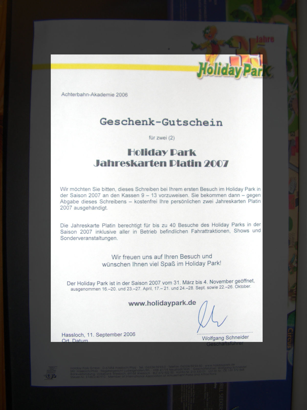 Ich habe von der Achterbahn-Akademie einen Geschenk-Gutschein für 2 Holidaypark Jahreskarten Platin für die Saison 2007, welche zu je 40 Besuchen berechtigen. Nun habe ich allerdings keine größere Verwendung dafür und dachte mir wo fragen wenn nicht hier. Da es sich um einen Gutschein handelt ist nur ein Verkauf beider Karten auf einmal möglich. Hier ein Bild mit dem genauen Text: