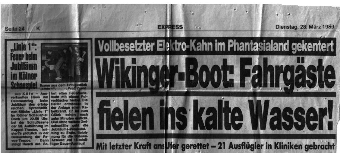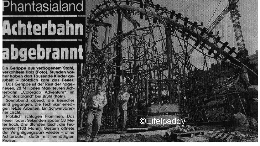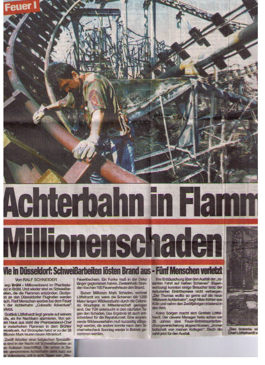 Das stimmt so nicht! Die Bahn wurde zum Saisonstart 1996 eröffnet. Ich war mit meiner Familie Anfang April da und wir sind die Bahn auch gefahren. Gebrannt hat es dann Mitte Mai (soweit ich mich erinnern kann) Die Wiedereröffnung war dann mit Michael Jackson zusammen. Darüber gab es auch einen Artikel im Kölner Stadtanzeiger (um mal wieder ontopic zu kommen) Hab nur leider keine Zeitungsartikel aufgehoben.