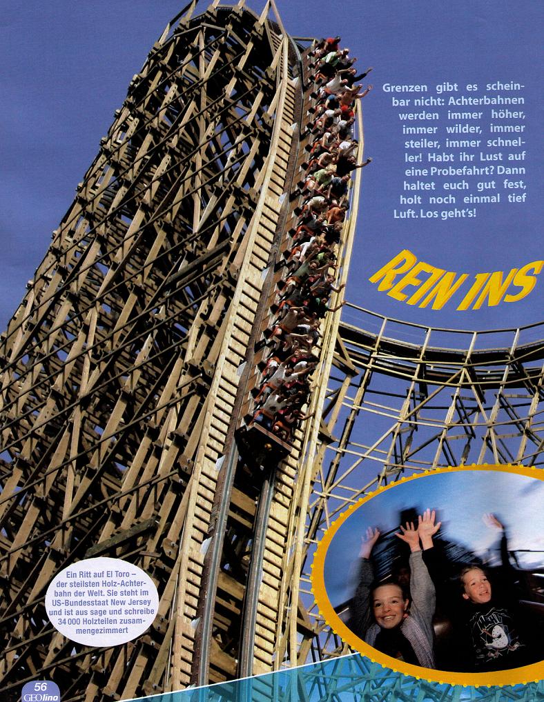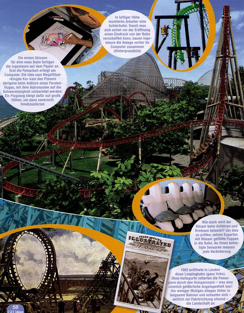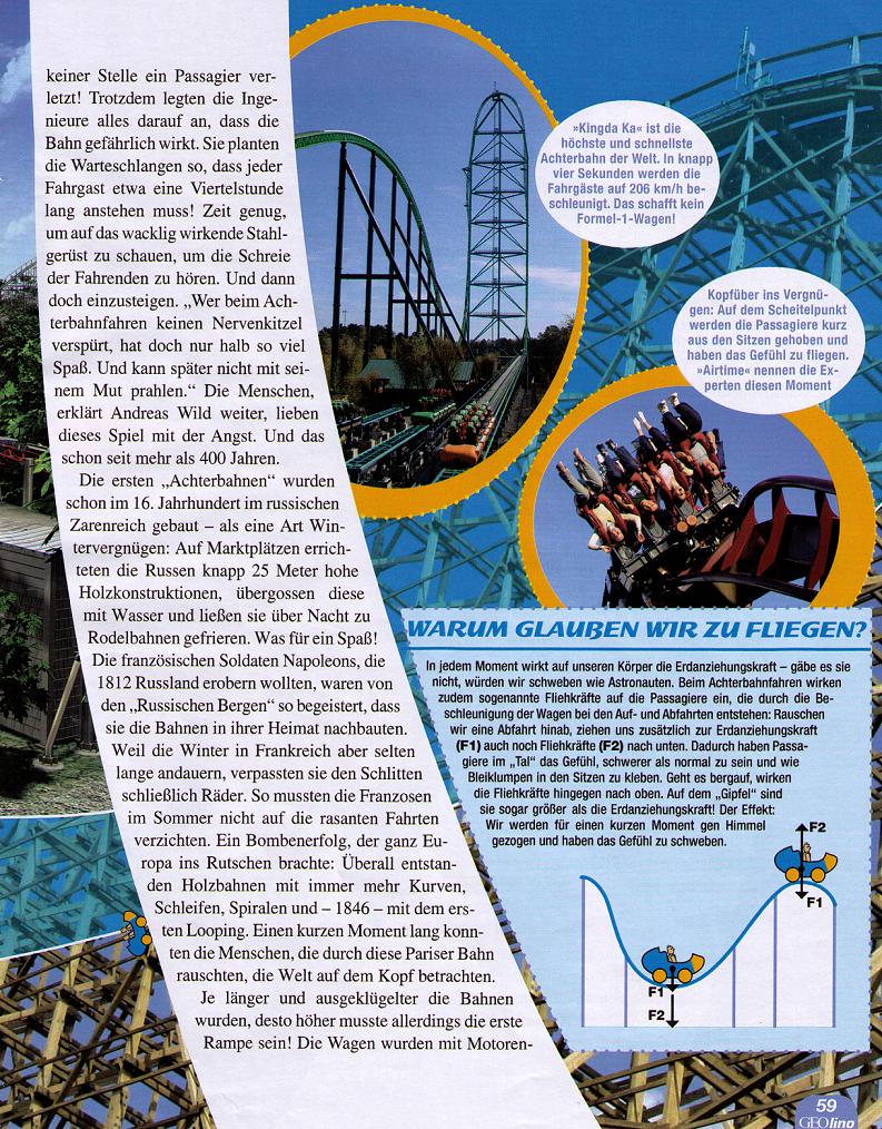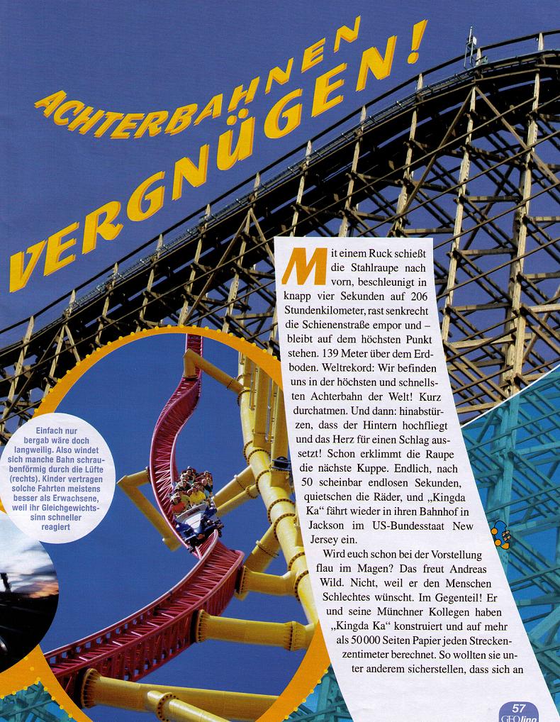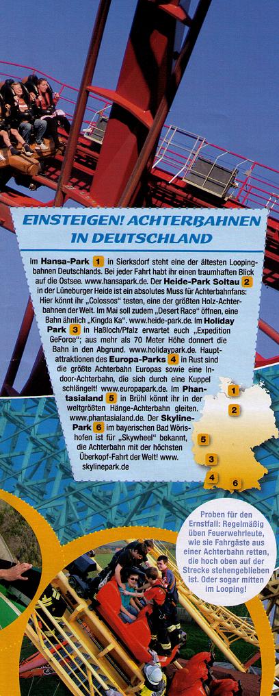 heut morgen habe ich beim durchstöbern der Zeitungen die neue Geo Lino Ausgabe entdeckt, in der ein mehrseitiger Bericht über Achterbahnen ist. Auf den ersten Blick mal etwas anderes, da Kingda Ka nicht wirklich auseinandergenommen wird, stattdessen sind Bilder verschiedener Bahnen drin, zu denen immer etwas geschrieben steht. Unter anderem ist eine kleine Skizze und ein Rendering von Maverick zu sehen...neben einigen weiteren Bilder werden die Fliehkräfte erklärt, man reist in die Vergangenheit oder wird über die Sicherheit aufgeklärt.