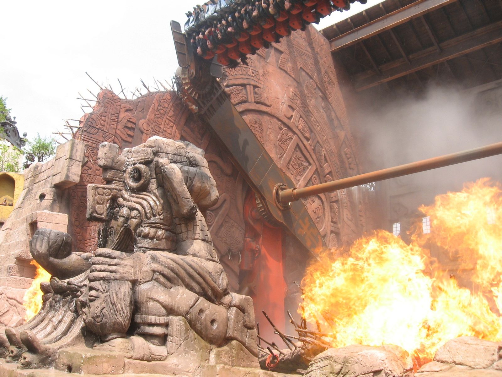 Ok, First Official Rider On Talocan bin ich wohl. Die Sitze sind nass durch den Nebel. Alle haben Platz genommen, die Gondel ist kaum gefüllt, in der hinteren Reihe sitzen mit mir noch 4 andere. Die Bügel Schließen, die Hebebühne senkt sich. Wir gucken auf die hohe Hinterwand und ihre Aztekischen Reliefs, Nebel strömt aus den Düsen über uns. Endlich fahrne wir Talocan. Eine Stimme ertönt, leicht bedrohlich, leicht wütend. Die Gondel setzt sich in Bewegung, wir steigen höher und höher, die Wasserfontänen schießen in die Höhe, unsere Füsse werden nass. Die Gondel wird ausgeklingt und wir schwingen. Die Richtung wechselt und wir rasen an der Hinterwand entlang. Wir Überschlagen und jedoch nicht wirklich von den Feuereffekten bekommen wir in der hinteren Reihe nicht viel mit. Dann ist die Fahrt auch schon anch ein paar Drehungen vorbei. Wir fahren nach unten, es dauert eine Zeit lang, bis die Gondel zum stehen kommt. Ich hatte etwas mehr erwartet und bin enttäuscht, aber das sollte sich zum Glück ändern.