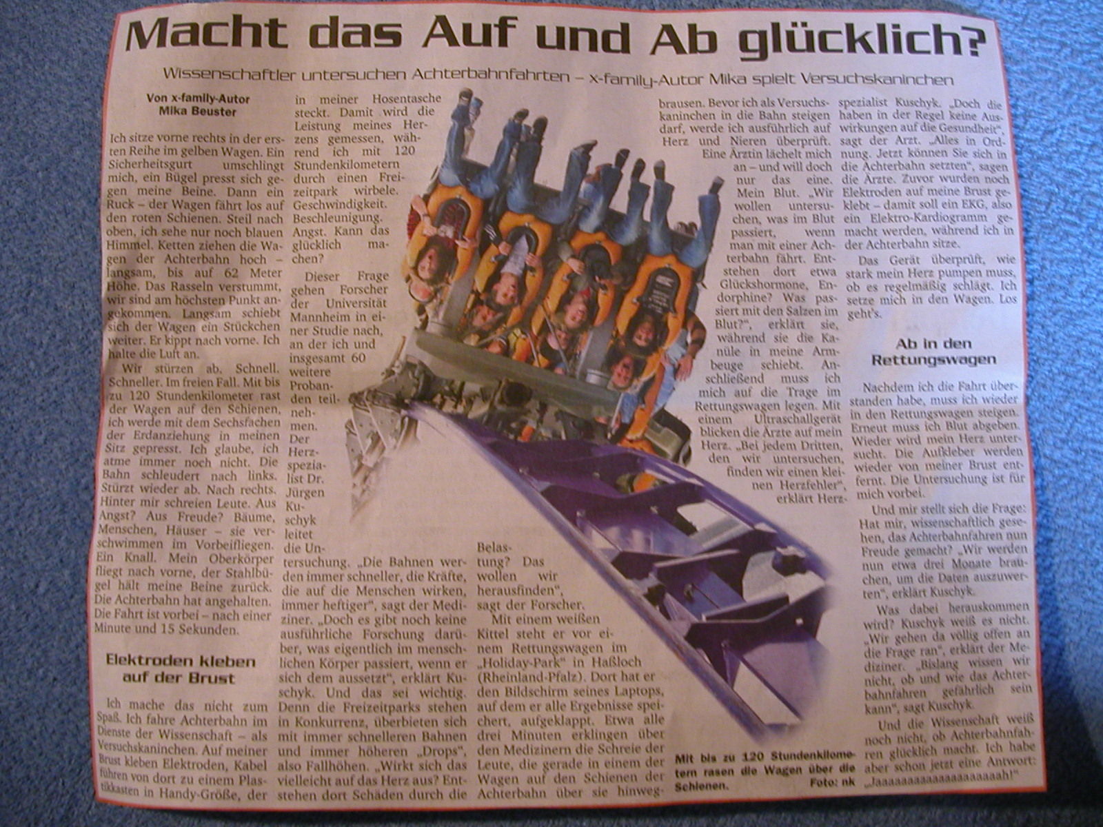 Gestern war ein Bericht über eine wissenschaftliche Untersuchung aus dem Holiday Park in der Zeitung (Nordbayerischer Kurier). Ich hab ihn mal fotographiert. Das Bild ist auch in groß verfügbar, dann lässt es sich besser lesen. Der Bericht selbst ist recht interessant, auch wenn wir ja wissen, dass die GeForce nur 53 Meter Schienenhöhe hat und auch keine 6g erreicht werden.