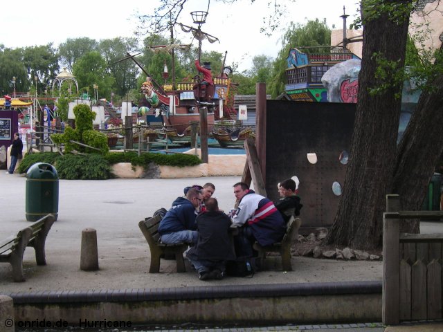 Themingmäßig deutlich beeindruckender stellt sich meiner Meinung nach noch Maelstrom, der Frisbee des Parks dar. Mit den Umgebogenen Lampen, den verwehten Zäunen, den maritimen Gimmicks sieht das Teil richtig klasse aus und es fährt sich auch super! Der Wind, den das Gerät erzeugt, unterstreicht das Theming auch ganz gut…