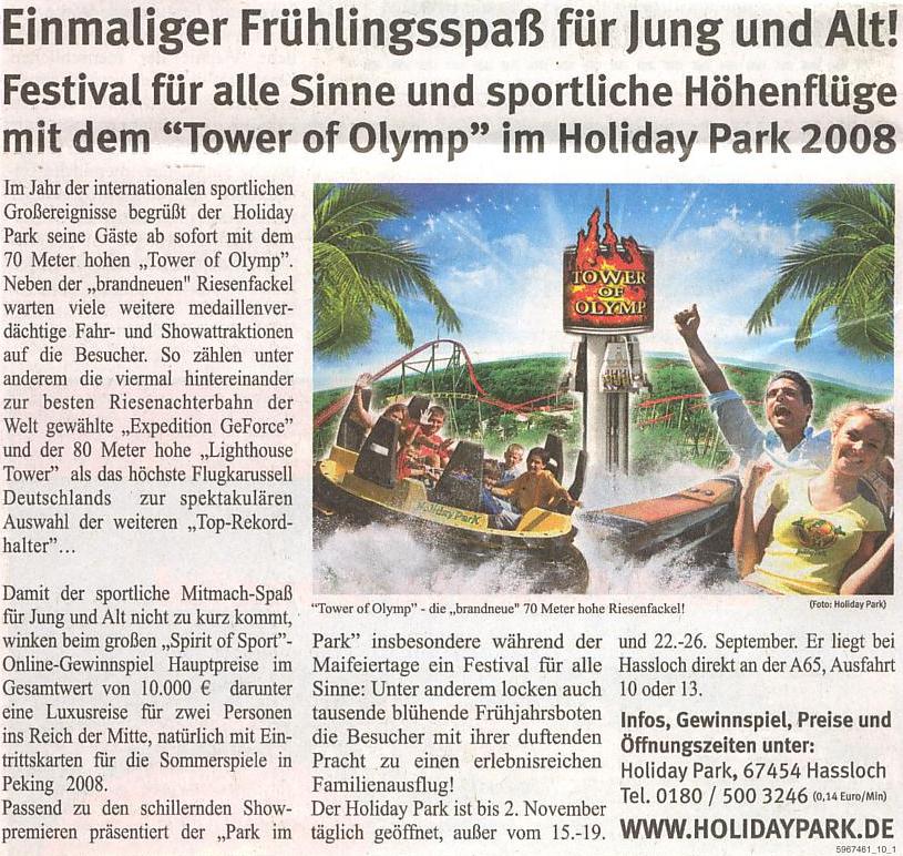 Mit der offiziellen Eröffnung des „Tower of Olymp“ startet für die Athleten des „Team Peking 2008 der Metropolregion Rhein-Neckar“ ein sprichwörtlicher Höhepunkt, der in Deutschland einmalig ist! Zur optimalen Vorbereitung und Motivation überreicht der Holiday Park den Top-Sportlern und Medaillenanwärtern des „Team Peking 2008“ und den Besuchern ein 70 Meter hohes Mega-Trainingsgerät. Ab sofort fungiert Europas erster „Free Fall Tower umthematisiert als das neue sportliche Wahrzeichen der Region: „Tower of Olymp“.