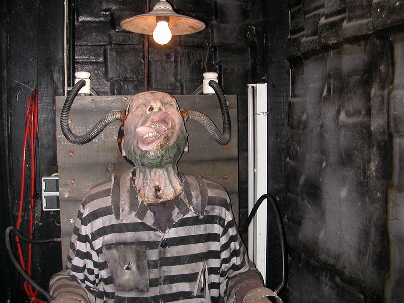 Der Eingang zur Geisterbahn ist wirklich toll gemacht, von außen nicht einsehbar und innen sehr dunkel gehalten. Die spannende Atmosphäre der Q-Line wird durch Gruselgeräusche und das flackernde Licht der Deckenlampen unterstützt.