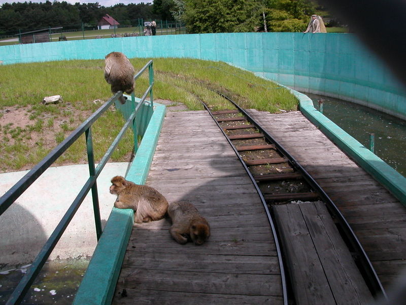 Hier das Affengehege, eines der coolen Personal-Einsatzfahrzeuge (ein guter alter Golf II) für Tierpfleger und Techniker und ein Kiosk mit lecker Eis, Souvenirs, etc.
