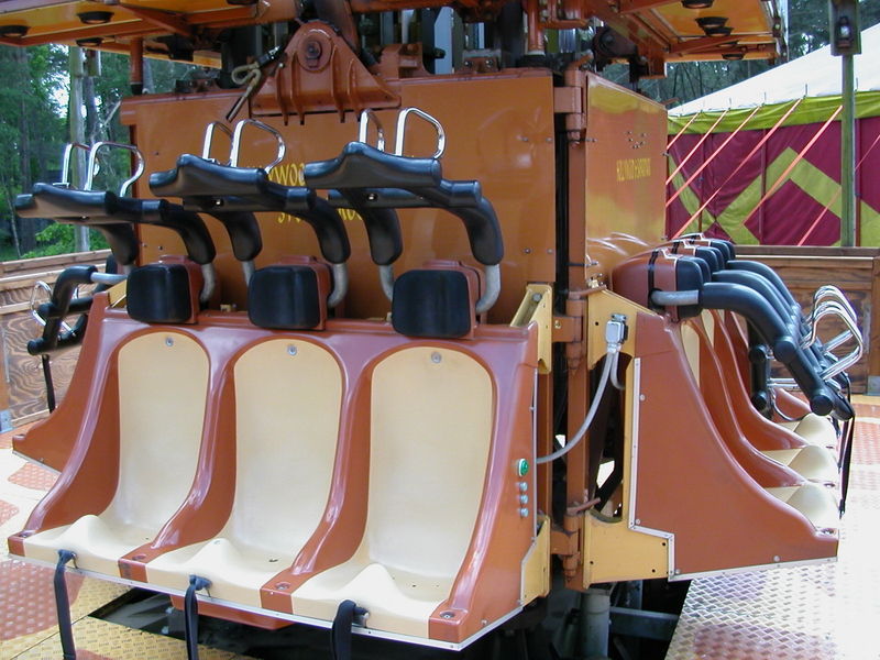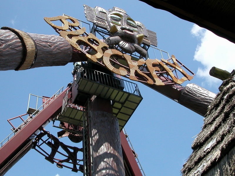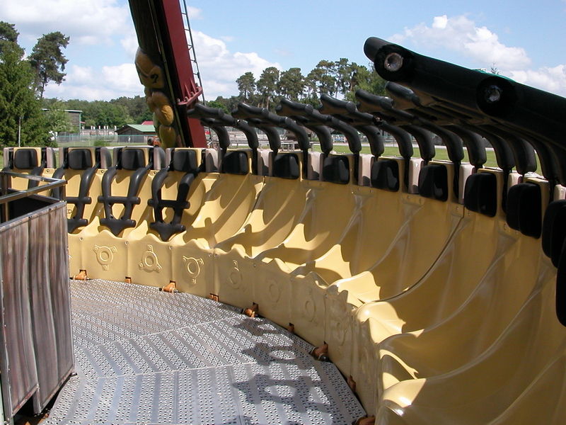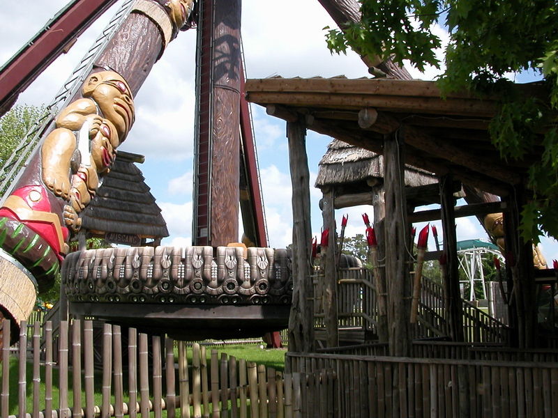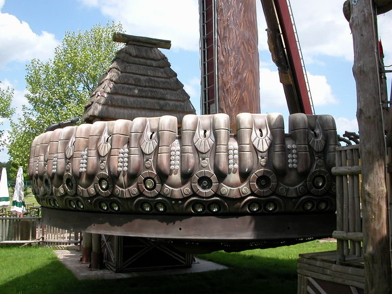 Gleich gegenüber: "Blackfly" von Fabbri, mit einer sehr schönen Thematisierungen und toller Fahrt! Anders als beim "Frisbee" von Huss wird die schaukelnde und um die eigene Achse rotierende Plattform von oben angetrieben - es ließe sich also sogar der Boden unter der Plattform noch mit Mosaiken oder afrikanischer Bemalung gestalten.