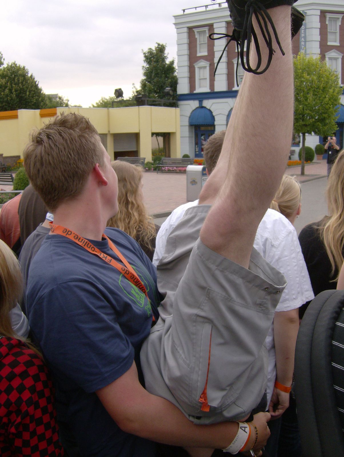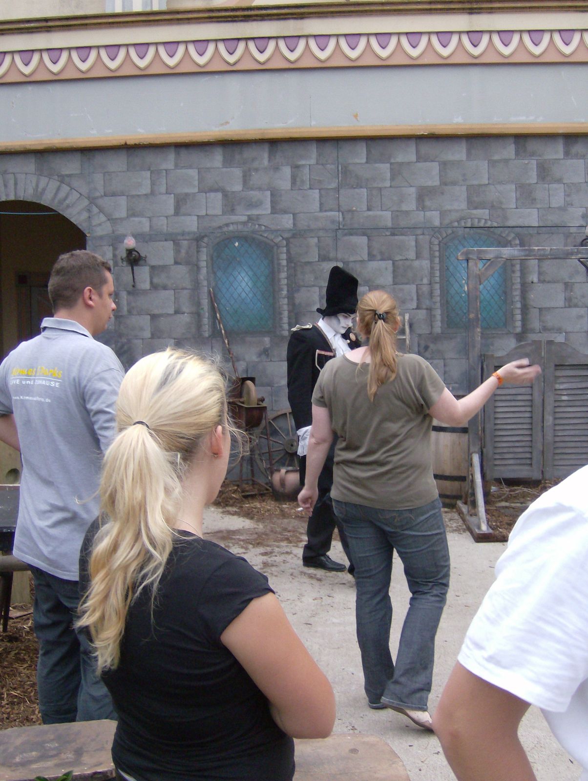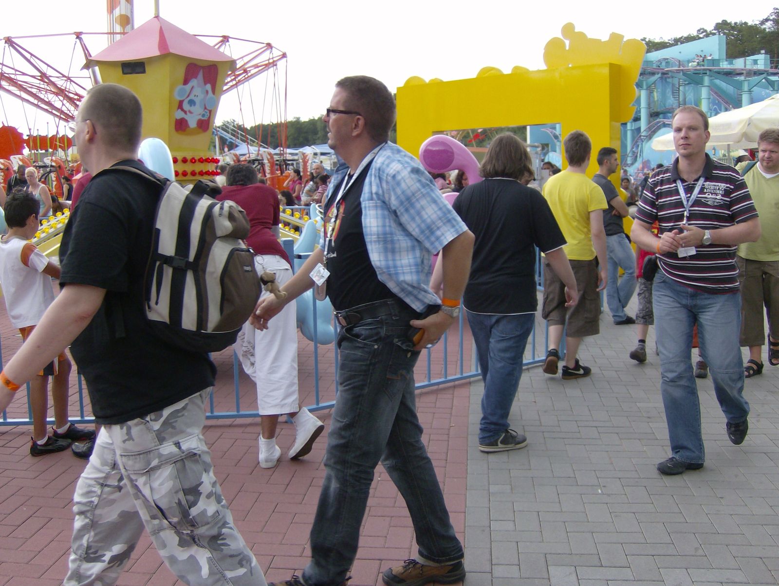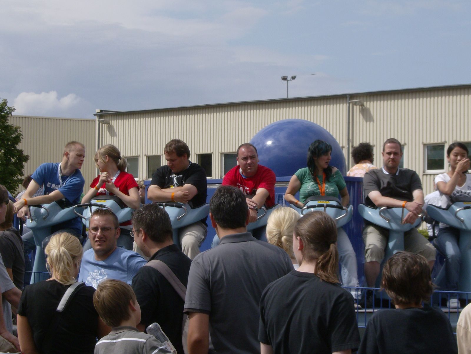 Der nächste Programmpunkt war dann der Time-Rider, den Volker alleine besucht hat. Während des Wartens fiel mir auf, dass die FKFler wohl eher in Zweiergruppen unterwegs sind, während die onRider doch eher in Rudeln auftreten (leider bog die Gruppe in den Time-Rider ein, bevor ich sie knipsen konnte).