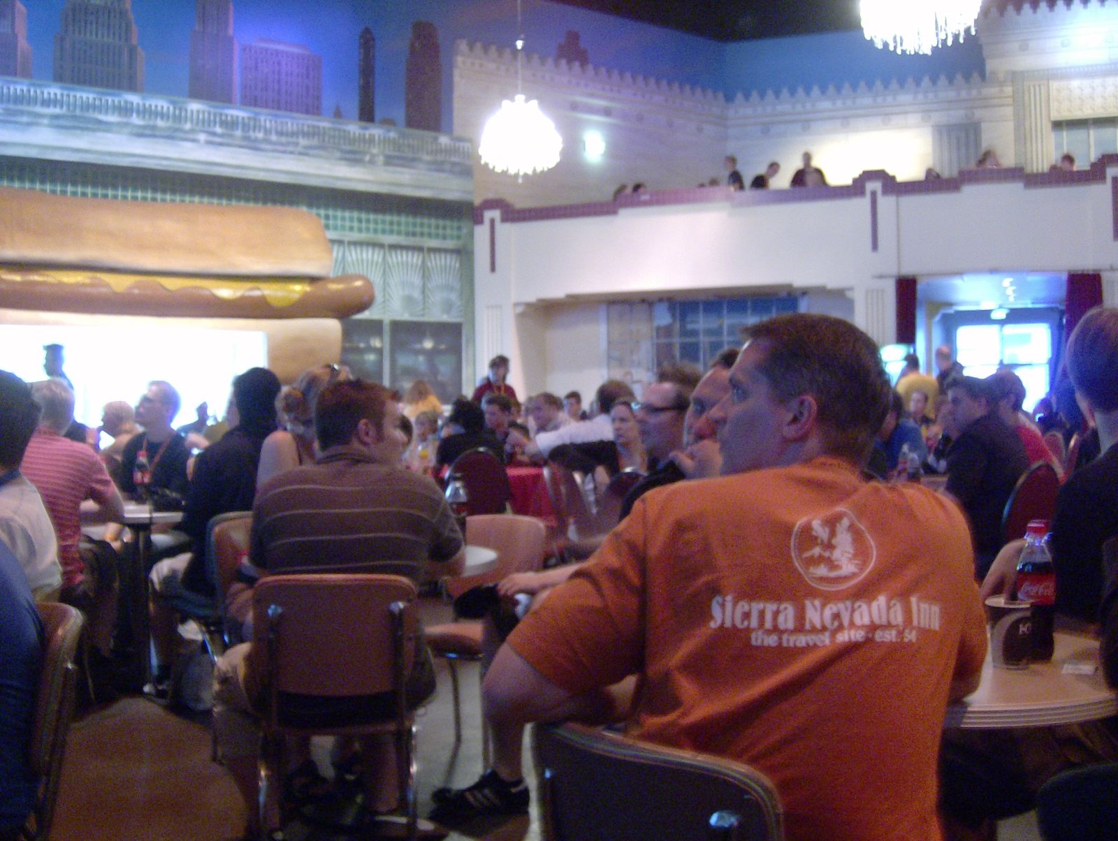 Als wir in den Buffet-Bereich gingen, hiess es, es sei symmetrisch aufgebaut. Dies war leider nicht der Fall, und so stand ich (der ich nach rechts ging) vor dem kalten Buffet, aber nicht vor dem Warmen. Leider ist es aufgrund des asymmetrischen Raumes nicht ohne weiteres möglich, dass man zwei Schlangen bilden kann, obwohl der heisse Bereich schon so aufgebaut ist. Das Problem hier ist, dass das kalte Buffet nur rechts vom heissen Bereich ist, und links waren die Getränke. (Wo es auch zu Geknäul kam, da dort die einzige Bier-Ausgabe war).
