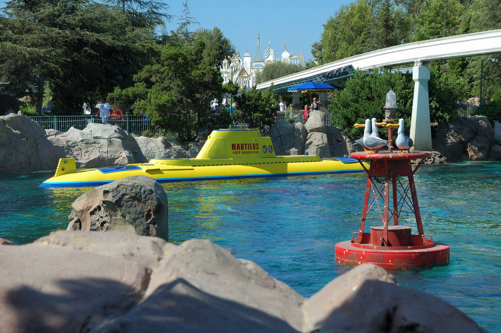 Hat man es tatsächlich pünktlich zur Parköffnung geschafft (Hand aufs Herz: Mir ist das noch nie gelungen) ist ein guter Tipp, sich direkt in Richtung „Finding Nemo Submarine Voyage“ zu begeben: Diese Attraktion ist ein absolut einmaliges Must-See und verfügt weder über Kapazität, noch (derzeit) über ein Fast-Pass-System. Der Ride, der ursprünglich 1959 eröffnete, war von 1998 bis 2007 geschlossen, damals drehte sich der Ride zwar auch um Nemo, nur ursprünglich nicht um den Clownfisch, sondern um den gleichnamigen Kapitän der Nautilus. Der Ride simuliert eine Unterwasserfahrt – was heißt simuliert... es