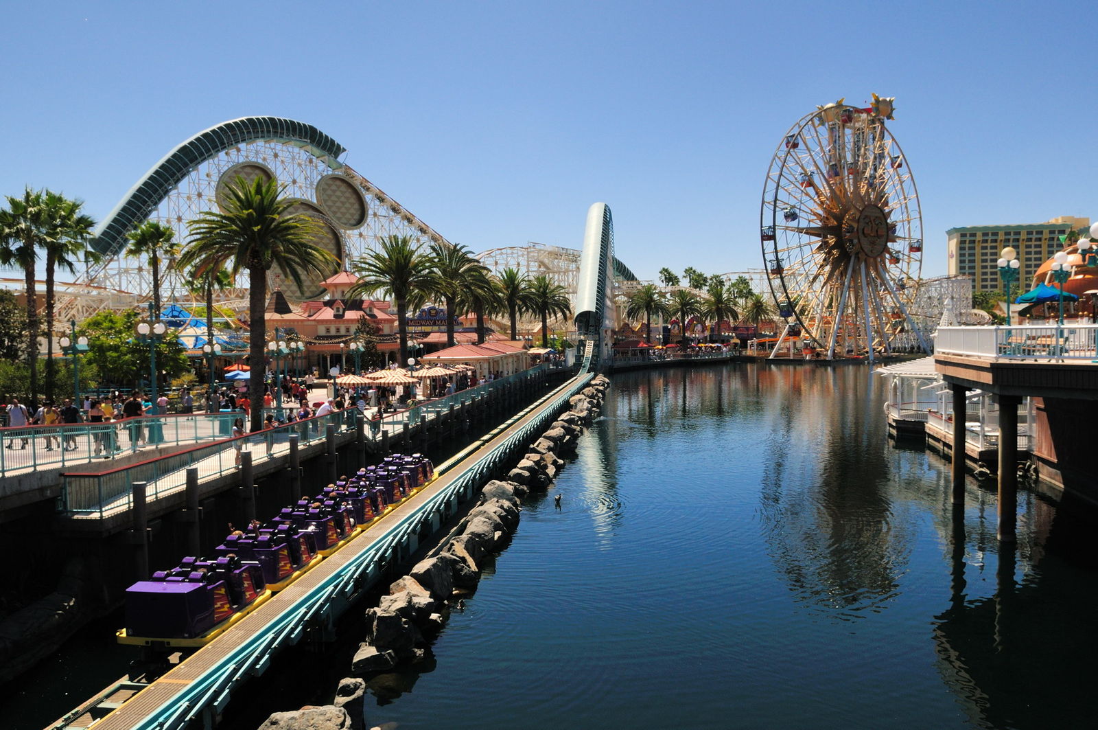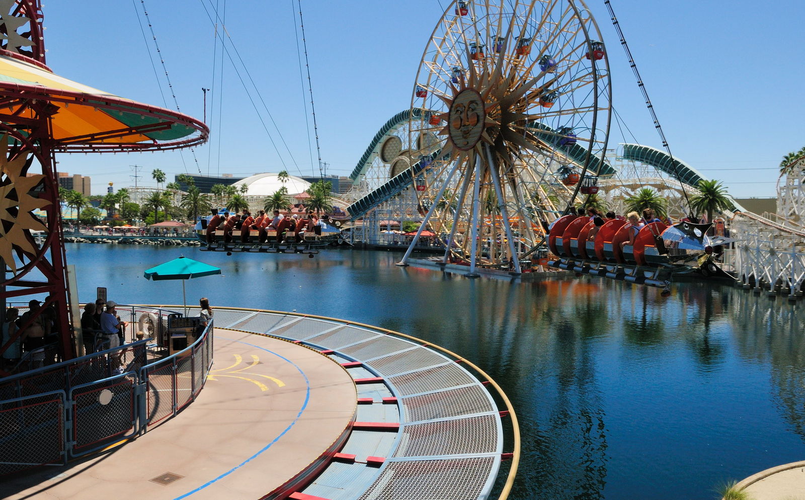 S&S Spaceshot „Maliboomer“ (mit Kreisch-Schutz aus Plexiglas), das Riesenrad „Sun Wheel“ mit 8 festen und 16 schaukelnden Gondeln, sowie das Raketen-Karussel „Golden Zephyr“, das an die Captive Flying Machines in Blackpool erinnern, die Disney Imageneers tatsächlich als Vorlage genommen haben.