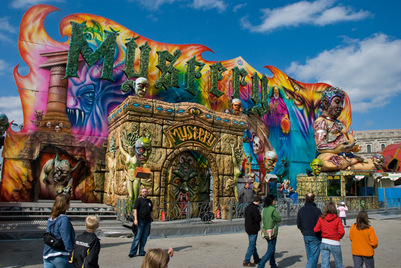 Wer mit dem Auto anreist, der parkt normalerweise an der Messe. Das kostet zwar 3 EUR, ist aber relativ stressfrei. Auf dem Weg vom Parkplatz auf den Platz passiert man den Eingang zur Kirmes mit etwas eigenwilligem Hinweis auf "korrektes Betragen" und steht dann zu Beginn des Rundlauf vor dem Mystery. So war es zumindest dieses Jahr im Herbst...