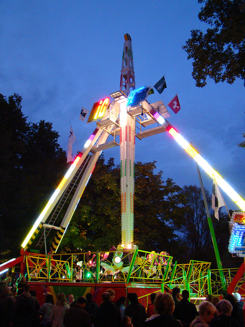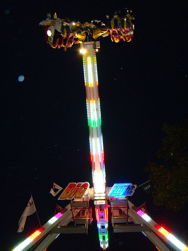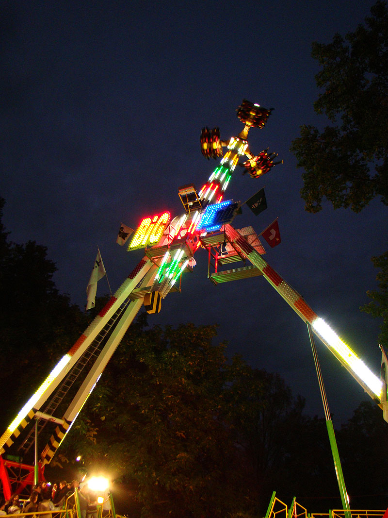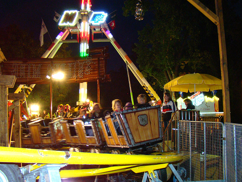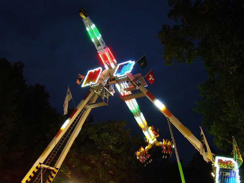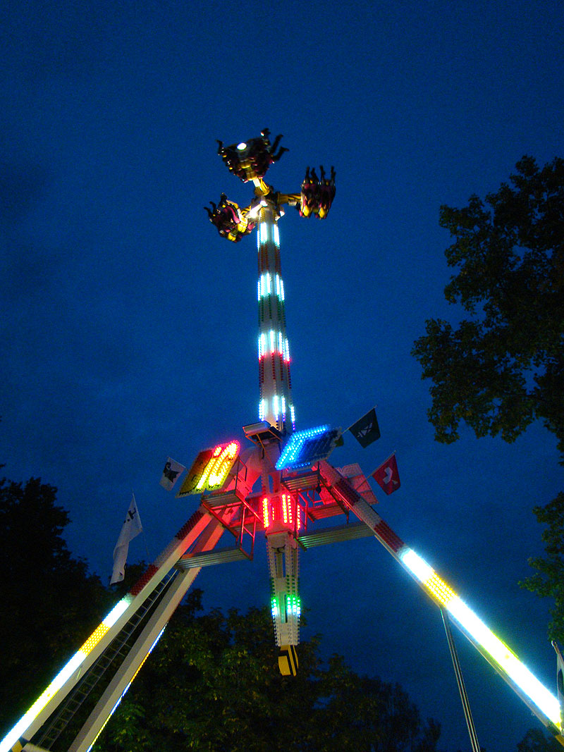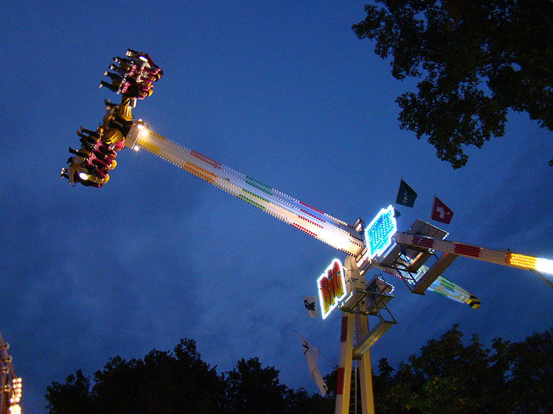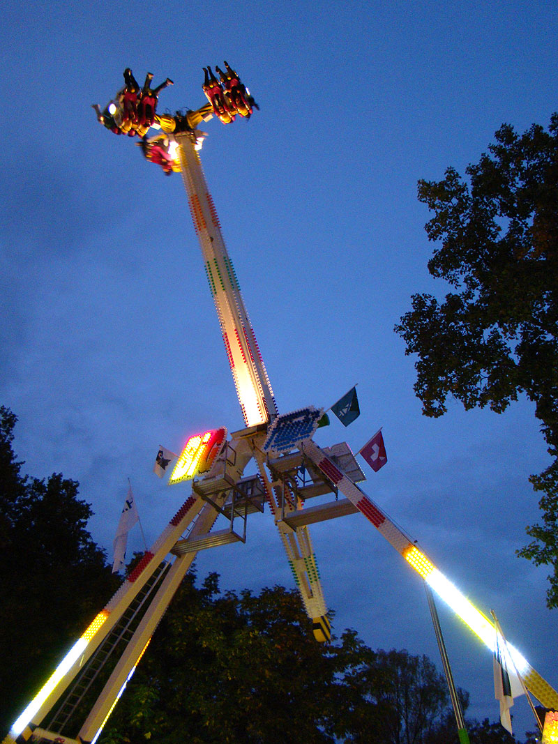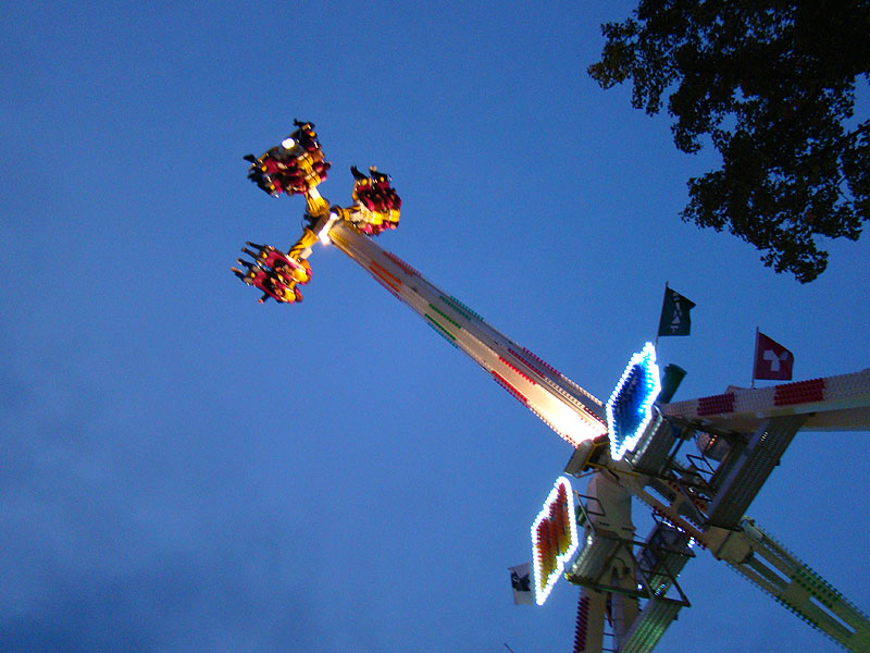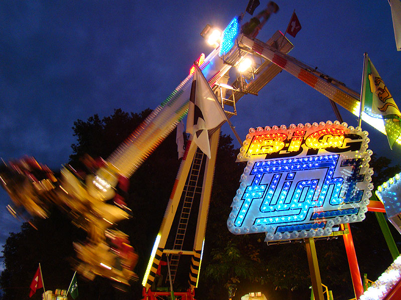 Eine Fahrt auf Big Flight kostet 8Fr. Es gab aber trotz Andrang anständig lange Fahrten, ja eher sogar zu lange Fahrten. So hat der eine oder andere das Fahrgeschäft grün im Gesicht verlassen. Ich selber habe es natürlich auch ausprobiert und muss sagen, es kickt ordentlich, wenn ich auch die Stationsdurchfahrt bei einem Afterburner noch etwas heftiger und damit besser finde. Erwähnenswert sind allerdings die ausserordentlich bequemen Sitze und Schulterbügel von KMG. Fantastisch wie sich damit Hangtime fährt, und davon hat man oben schliesslich mehr als genug. Ein tolles Gefühl, über Kopf auf dem Platz zu stehen und nach unten zu schauen. Die Gondelbremsen wurden nur kurz gelöst, ebenso wie bei Dominator bei gemässigter Pendelbewegung. Die Schaukellei ist aber dennoch in diesem Moment recht heftig und ich will es eigentlich gar nicht erleben, wenn dies bei kompletter Drehung des Armes geschehen würde. Beim Greifen der Gondelbremse kriegt man aber ordentlich eine geknallt, denn diese greift in der Sollposition trotz heftiger Schaukellei einfach zu. Alles in allem eine tolle Sache, allerdings fehlt einem dank der freien Sicht nach vorne ein Anhaltspunkt für die Augen, was ordentlich für Schwindel sorgt. Schlussendlich war auch mir total übel nach der Fahrt. Hier nun noch ein paar Bilder: