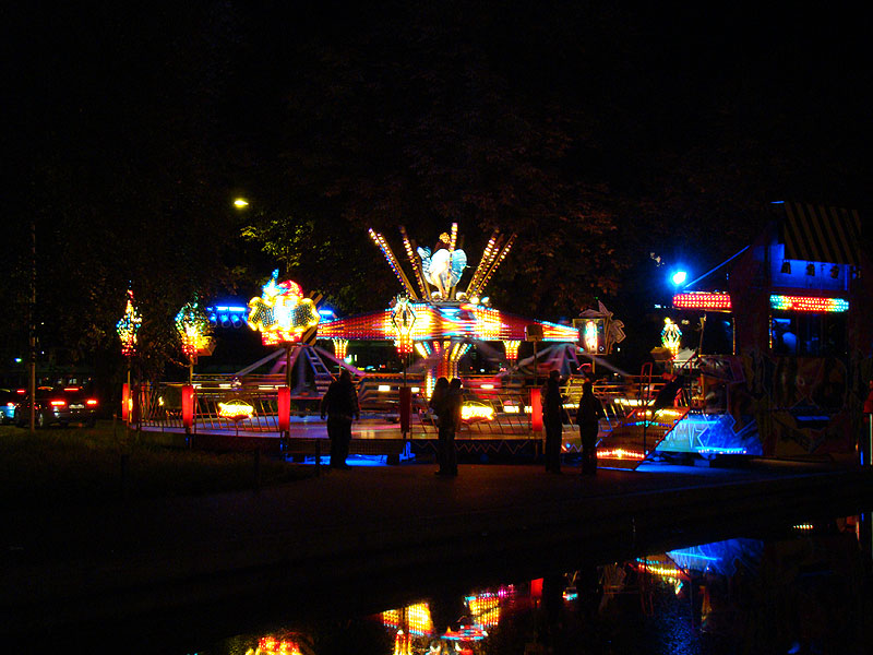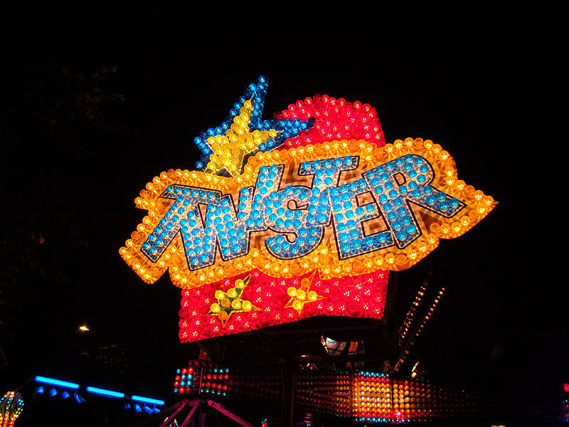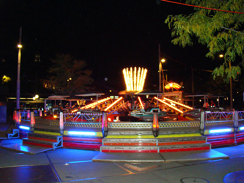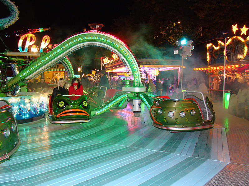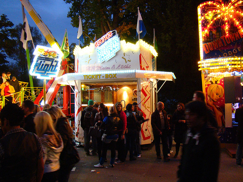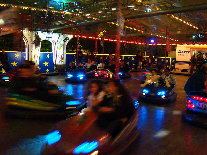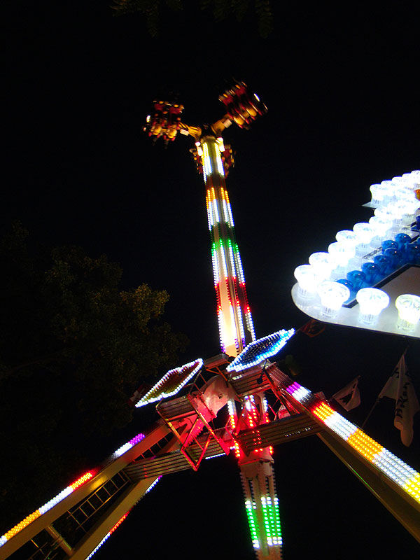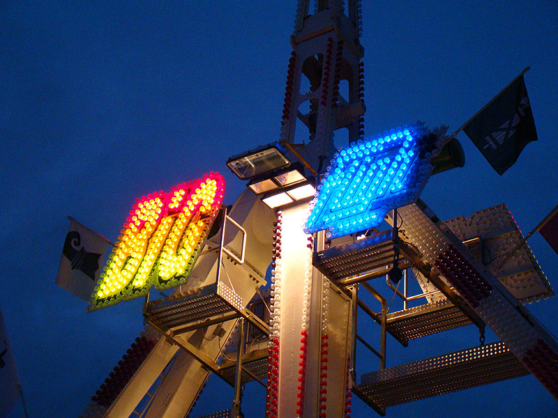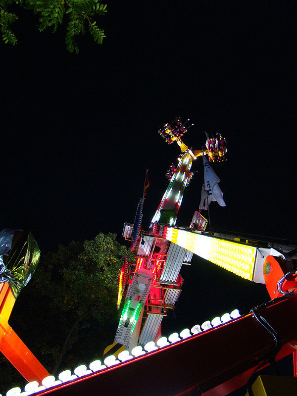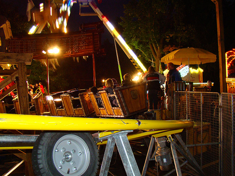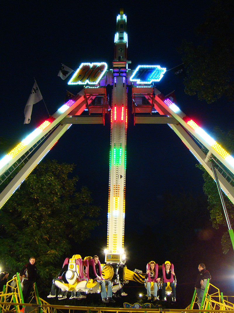 Eine Fahrt auf Big Flight kostet 8Fr. Es gab aber trotz Andrang anständig lange Fahrten, ja eher sogar zu lange Fahrten. So hat der eine oder andere das Fahrgeschäft grün im Gesicht verlassen. Ich selber habe es natürlich auch ausprobiert und muss sagen, es kickt ordentlich, wenn ich auch die Stationsdurchfahrt bei einem Afterburner noch etwas heftiger und damit besser finde. Erwähnenswert sind allerdings die ausserordentlich bequemen Sitze und Schulterbügel von KMG. Fantastisch wie sich damit Hangtime fährt, und davon hat man oben schliesslich mehr als genug. Ein tolles Gefühl, über Kopf auf dem Platz zu stehen und nach unten zu schauen. Die Gondelbremsen wurden nur kurz gelöst, ebenso wie bei Dominator bei gemässigter Pendelbewegung. Die Schaukellei ist aber dennoch in diesem Moment recht heftig und ich will es eigentlich gar nicht erleben, wenn dies bei kompletter Drehung des Armes geschehen würde. Beim Greifen der Gondelbremse kriegt man aber ordentlich eine geknallt, denn diese greift in der Sollposition trotz heftiger Schaukellei einfach zu. Alles in allem eine tolle Sache, allerdings fehlt einem dank der freien Sicht nach vorne ein Anhaltspunkt für die Augen, was ordentlich für Schwindel sorgt. Schlussendlich war auch mir total übel nach der Fahrt. Hier nun noch ein paar Bilder: