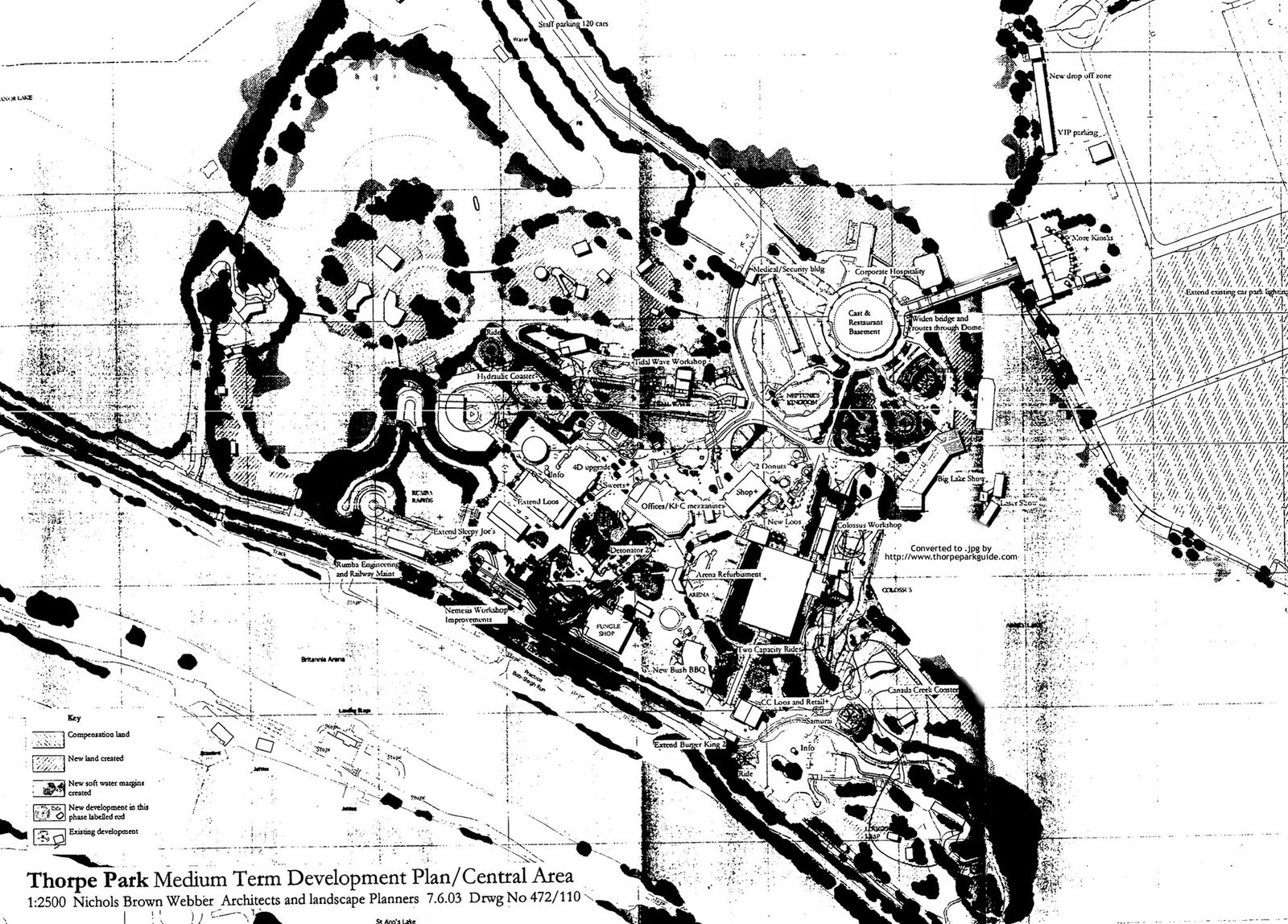 In der Tat muss Thorpe Land aufschütten um sich noch erweitern zu können. Das war bereits für Colossus, Stealth und jetzt den Eurofighter der Fall und soll nun im größeren Stil stattfinden. Anbei mal ein mittelfristiger Entwickungsplan für den Park, der jedoch aus dem Jahre 2003 ist und daher nicht mehr ganz stimmt.