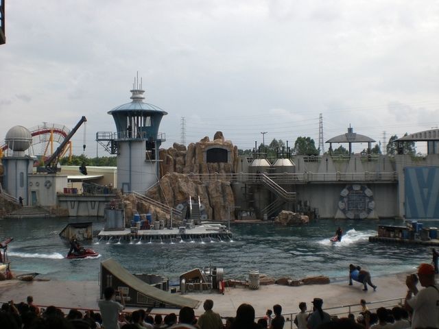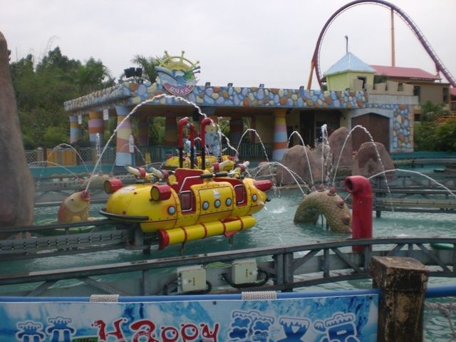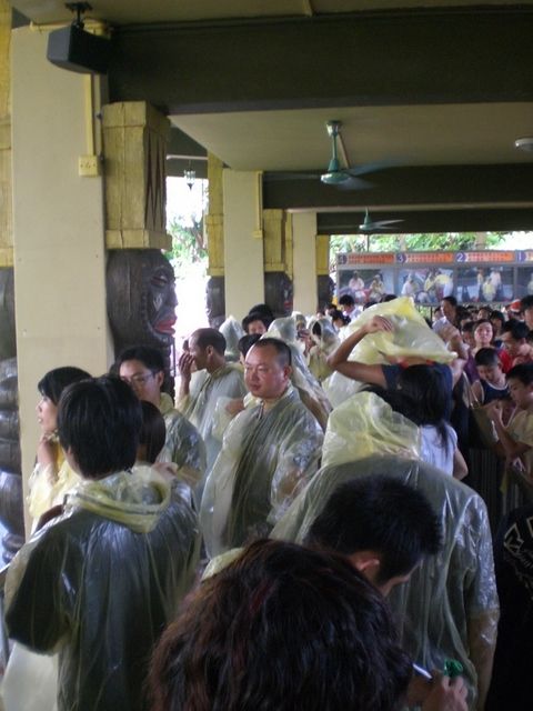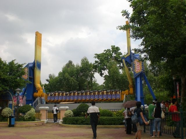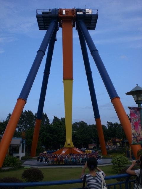 Diving Machine. Als wir durch den Eingang hindurch gingen fing es an zu regnen und ich hatte schon wieder das schlimmste befürchtet. Den in den anderen Parks habe ich es erlebt, das beim ersten Regentropfen alles zugemacht wird! Zum Glück war es dort nicht so und es hörte schnell wieder auf zu regnen. Die Abfertigung war genauso katastrophal wie in Peking!