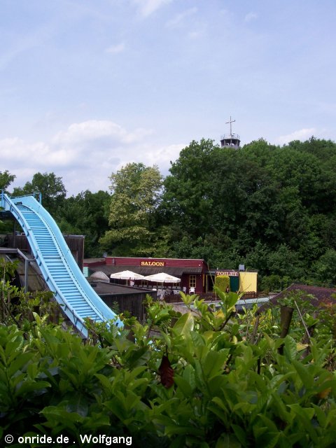 Von der Westernstadt aus kann man schon einen Teil der Wasserbahn "Es Nino" und den letzten von zwei Drops sehen.