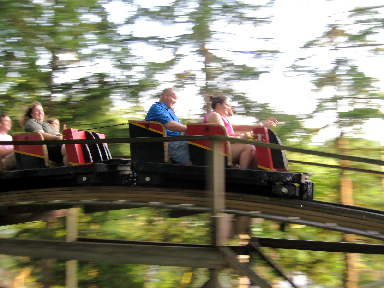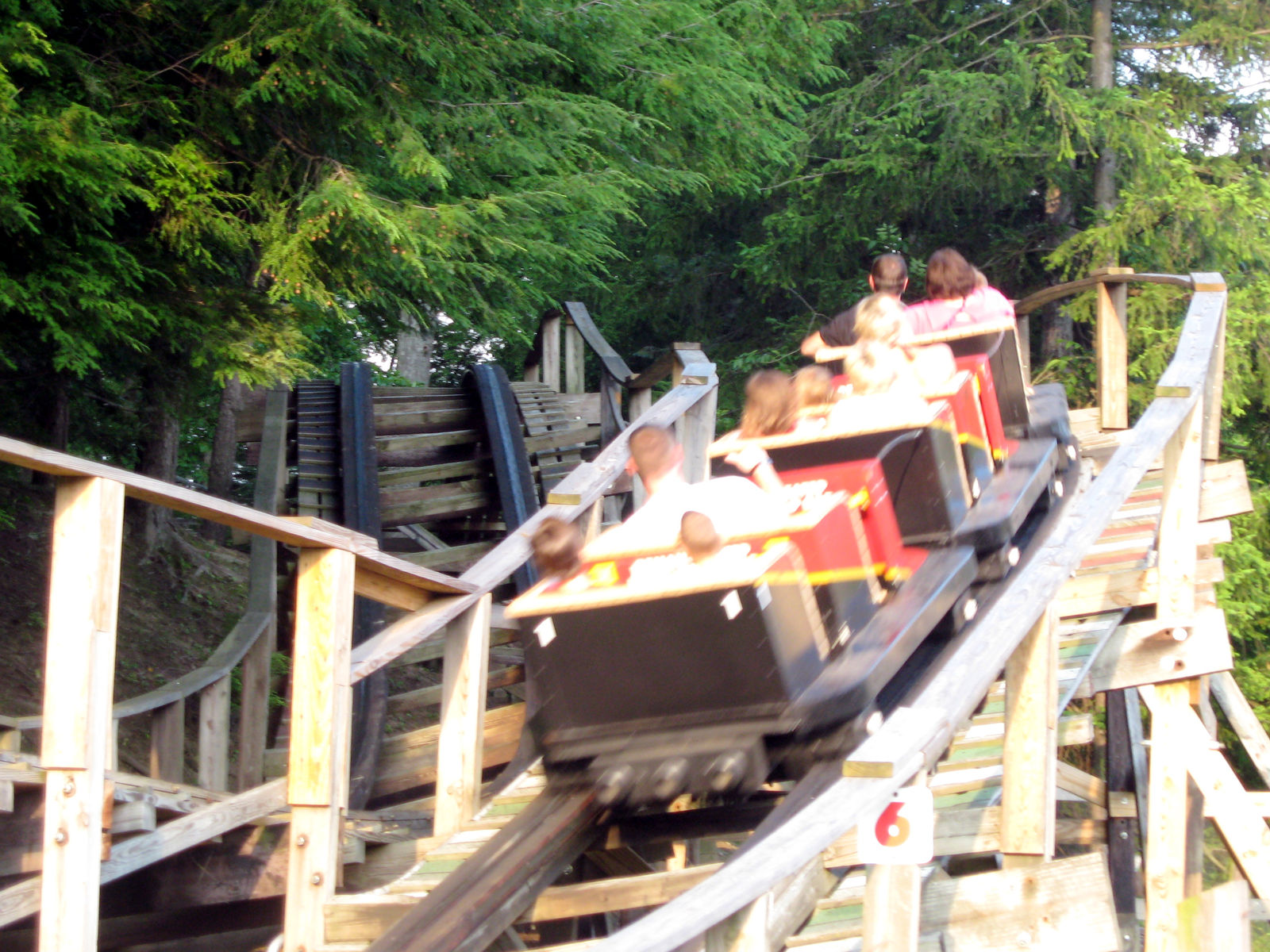 Klein aber oho dieser Woodie! Mal ganz von der schönen Lage am Berg unter den Bäumen konnte die Bahn durchaus überzeugen, für einen Kiddie sowieso, obwohl ich den Coaster nichtmal als einen solchen ansehe. Zwar ist die Bahn sehr kurz, aber auf der kurzen Strecke kann sie doch so einiges bieten. Dass es auch keine Bügel gibt sondern nur eine feste Haltestange macht das ganze nur noch besser. Timo und ich waren uns am Ende einig, der Coaster fährt sich wie der kleine Bruder von Boulder Dash. Beide Bahnen haben viel Ähnlichkeiten, in der Lage und bei den Fahrelementen. Halt nur alles eine Nummer kleiner. Boulder Dash Jr. Sozusagen. Auf jedenfall spaßig!