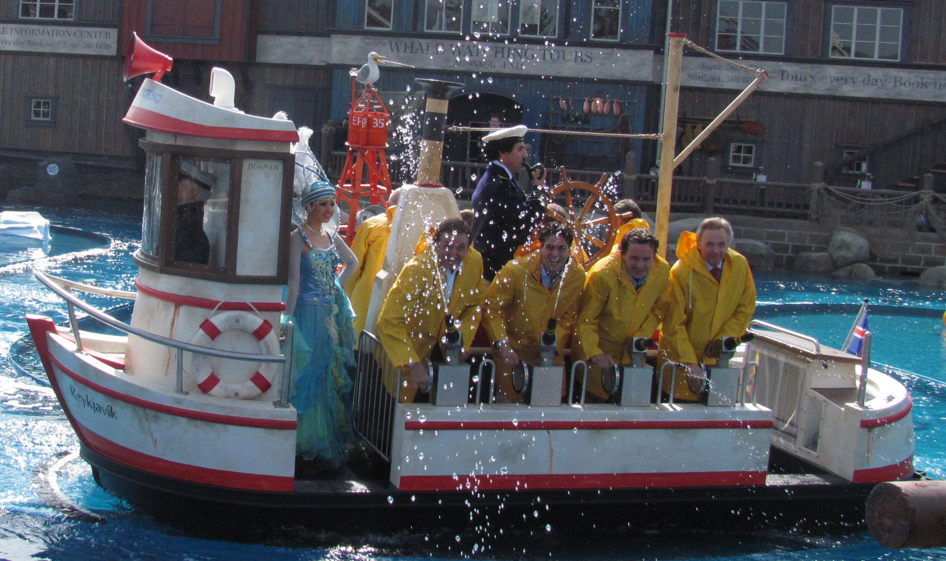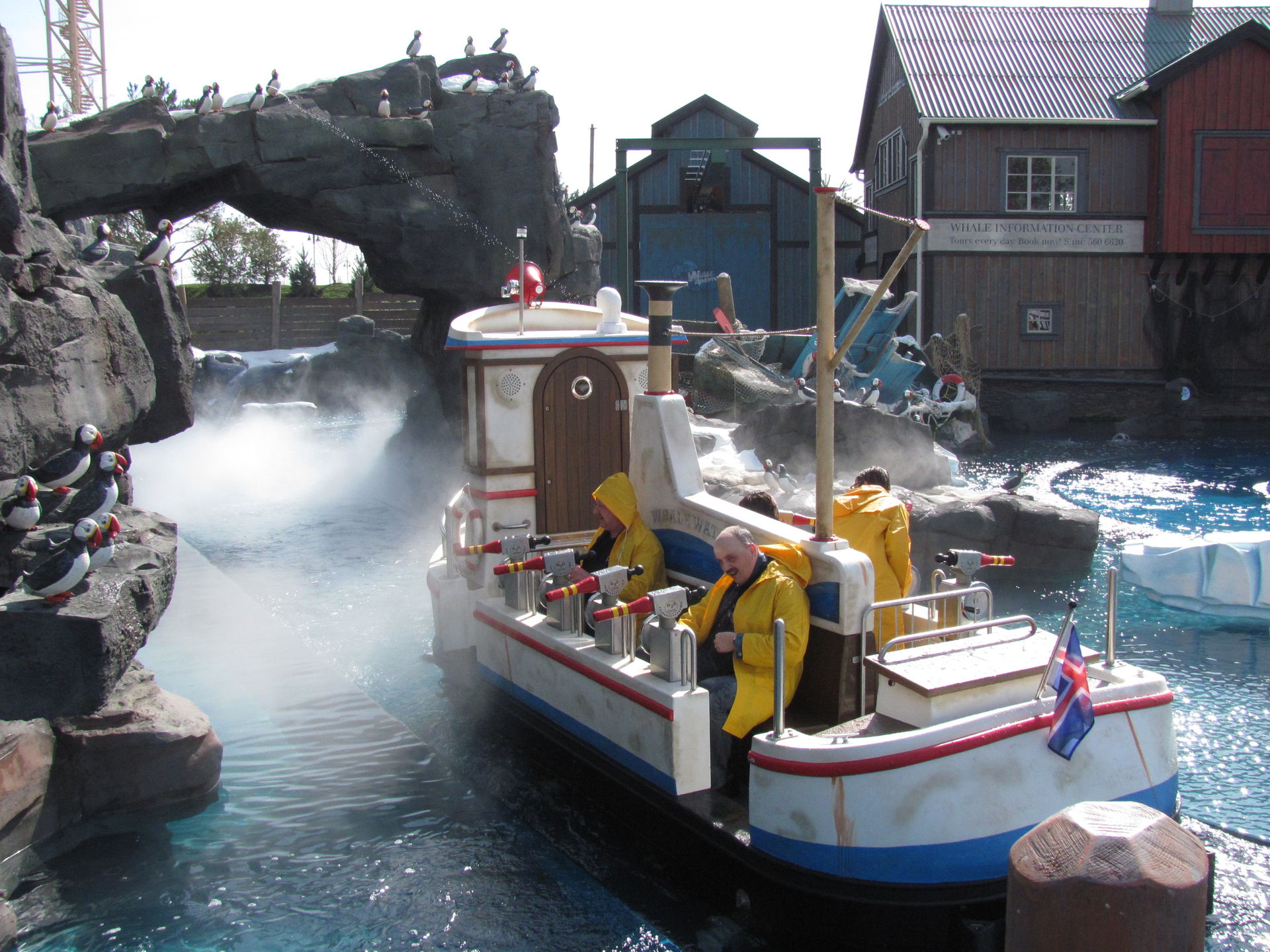 Das Erlebnis beginnt schon vor der eigentlichen Fahrt. Vor dem Haus der Reederei muss man sich erstmal einen Weg zwischen den ganzen Kisten suchen, um zur Treppe in den ersten Stock zu kommen. Kaum im Gebäude angekommen schaut man in ein grosses Auge, und erst beim zweiten Blick erkennt man, das es sich um eine in den USA angefertigte Nachbildung eines jungen Buckelwals handelt, der über der Einstiegsplattform an der Decke hängt. Einmal im Obergeschoss um Tilu, so nennt sich der Wal, herumgelaufen, hat man eine tolle Sicht auf das Hafenbecken, wo schon eine wilde Seeschlacht im Gange ist. Nur ein paar Treppenstufen weiter findet man sich schon in einem der 10 Ausflugskutter wieder. Auf dem nun folgenden 160 Meter langen Kurs, den man in 4 Minuten durchfährt, begegnet man einigen Robben, die auf einer Eisscholle treiben, unzähligen Papageientaucher, welche den Felsen rund um den 12 Meter hohen Leuchtturm bevölkern, und auf den letzten Metern sogar noch zwei der erwarteten Walen, welche die Passagiere auf ihre eigene Art Wilkommen heissen. Im ganzen Verlauf der Fahrt hat man immer wieder die Möglichkeit auf Zielscheiben oder Besucher am Ufer zu schiessen, doch Vorsicht, beide Ziele könne sich wehren!