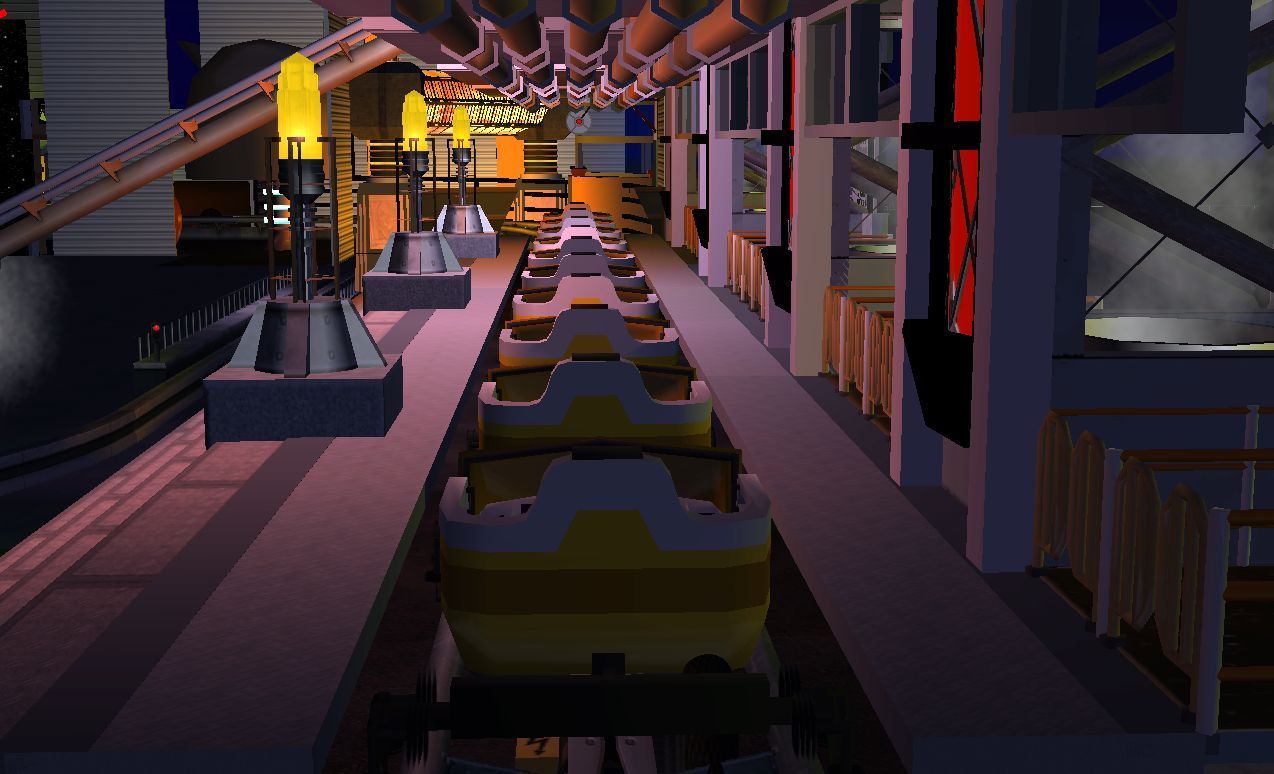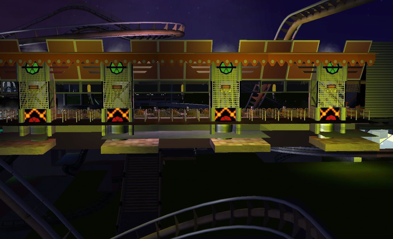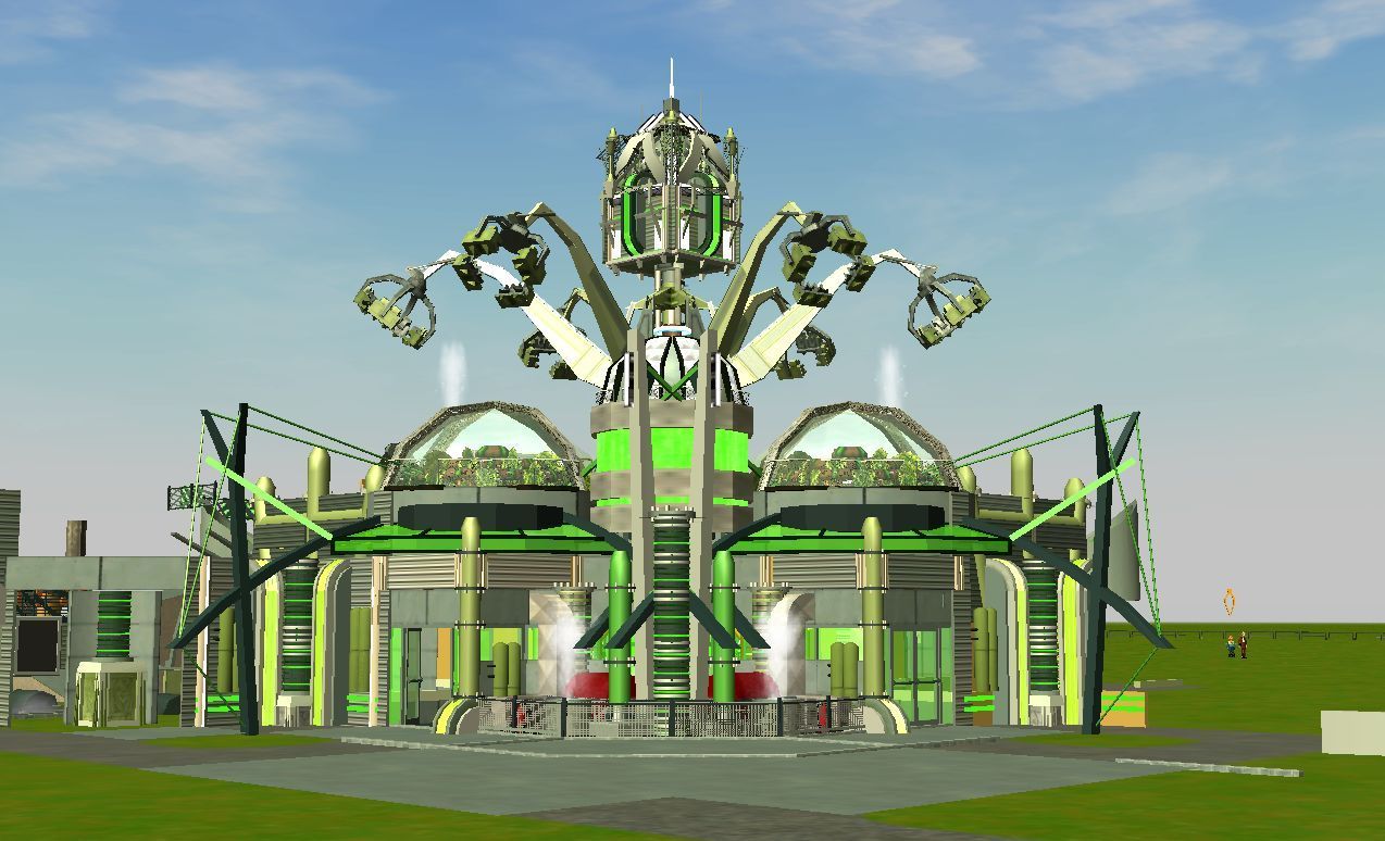 Heute gibt es die ersten Bilder vom Futurbereich. Insgesamt wird der Themenbereich 5 Attraktionen beherbergen. Davon sind bisher 4 von in einem im Bau befindlichen Zustand. Anfangen mit den Bildern tu ich heute aber mal beim Jump 2. Da dieses Gerät nicht sehr häufig in RCT 3 verwendet wird, und mir das Fahrprinzip doch irgendwie gefiel, habe ich diesen verwendet. Das Gerät wird später gleichzeitig einen weiteren Effekt erfüllen, nämlich für den Darkride einen Großteil der Halle verdecken.