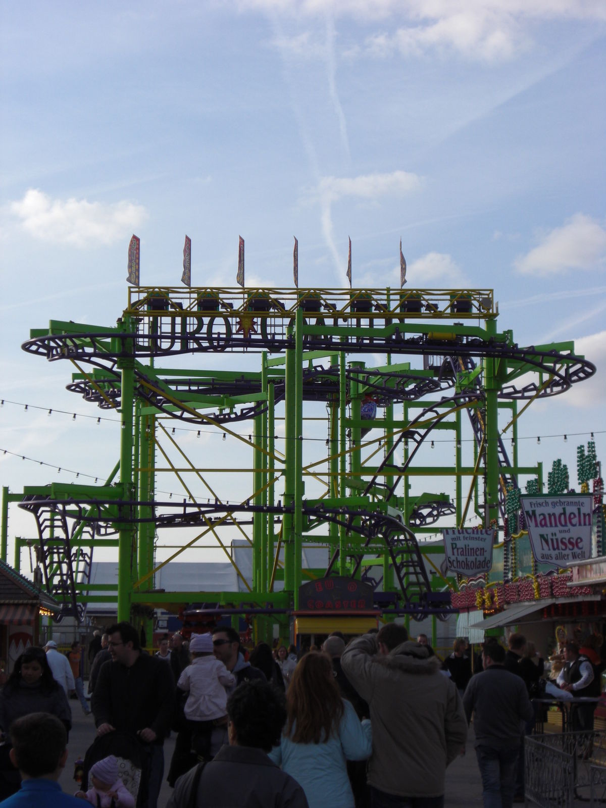 Das Riesenrad von Jost wurde diesmal am hinteren Eingang zur linken platziert. Als erster großer Blickfang sobald man de Eingang passiert fungiert der Euro-Coaster. Dieser fehlte mir in meinem "Coaster-Count" bislang noch. Daher gleich mal drauf. Fahrt, nu ja. Hat mich nicht sonderlich vom Hocker gerissen ganz ehrlich, einmal war ok, ein zweites mal werd ich da sicherlich nimmer drauf gehen. Zudem ich 4 Euro für ne "getunte Wilde-Maus" etwas arg teuer finde. Aber gut, war ganz witzig, jetzt kann ich mitreden. Jedenfalls wurde die Bahn vom Nürnberger Publikum überaus gut angenommen.