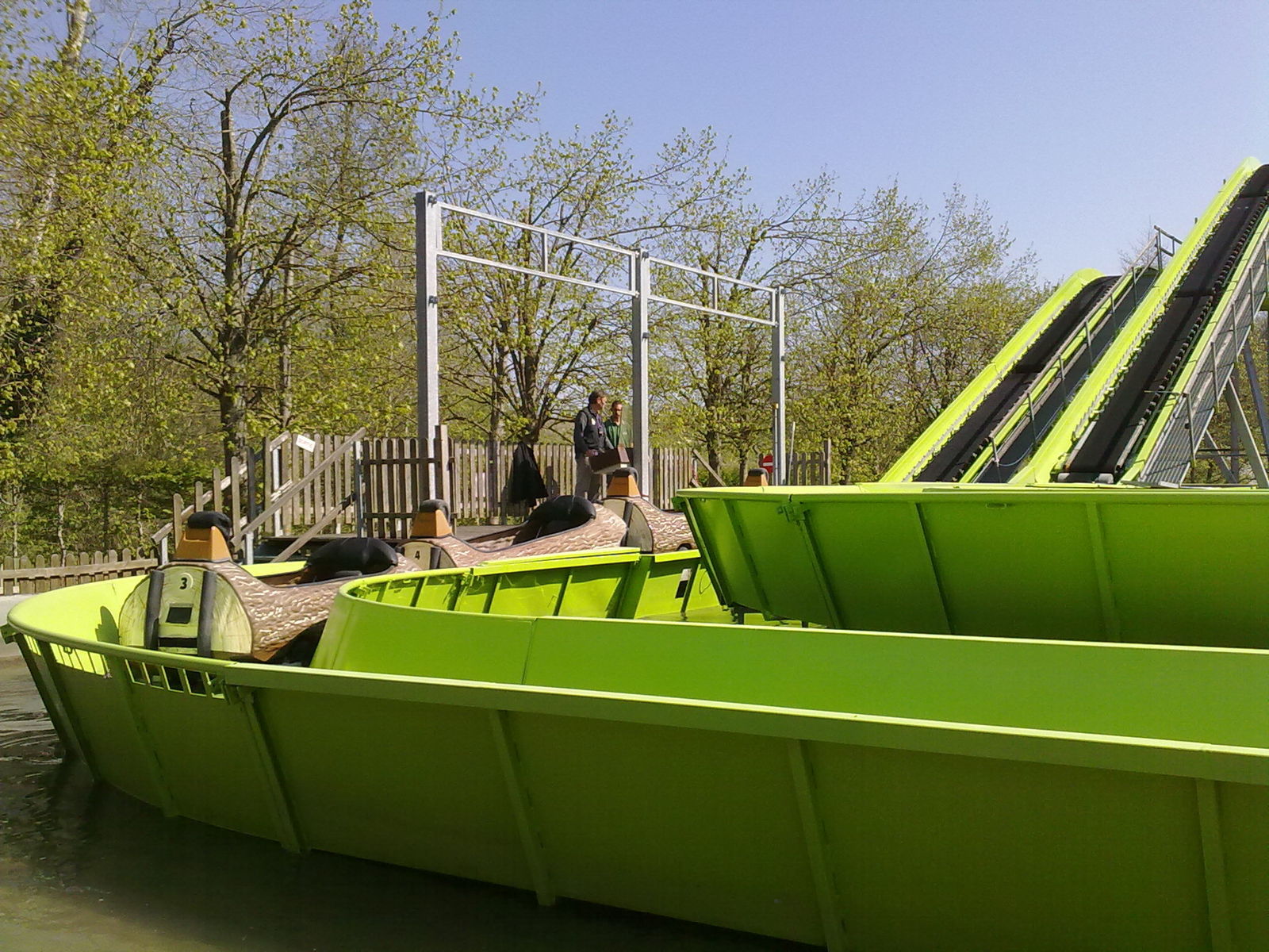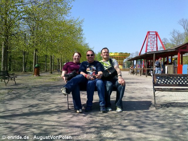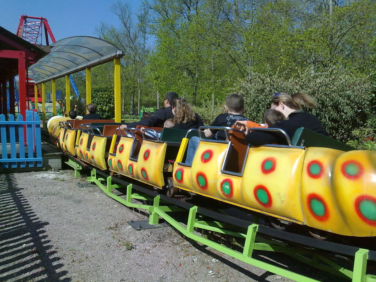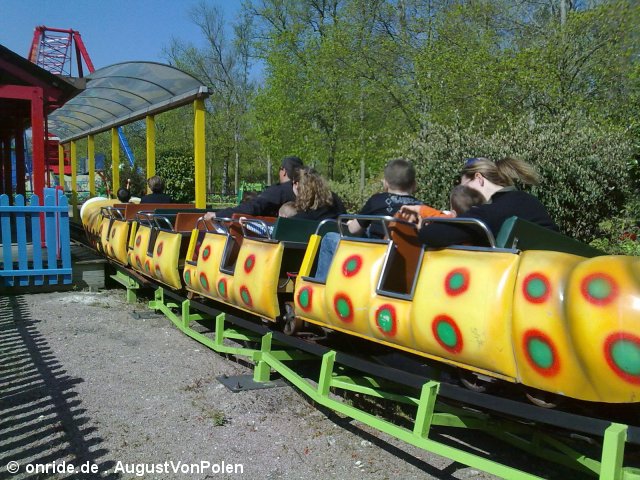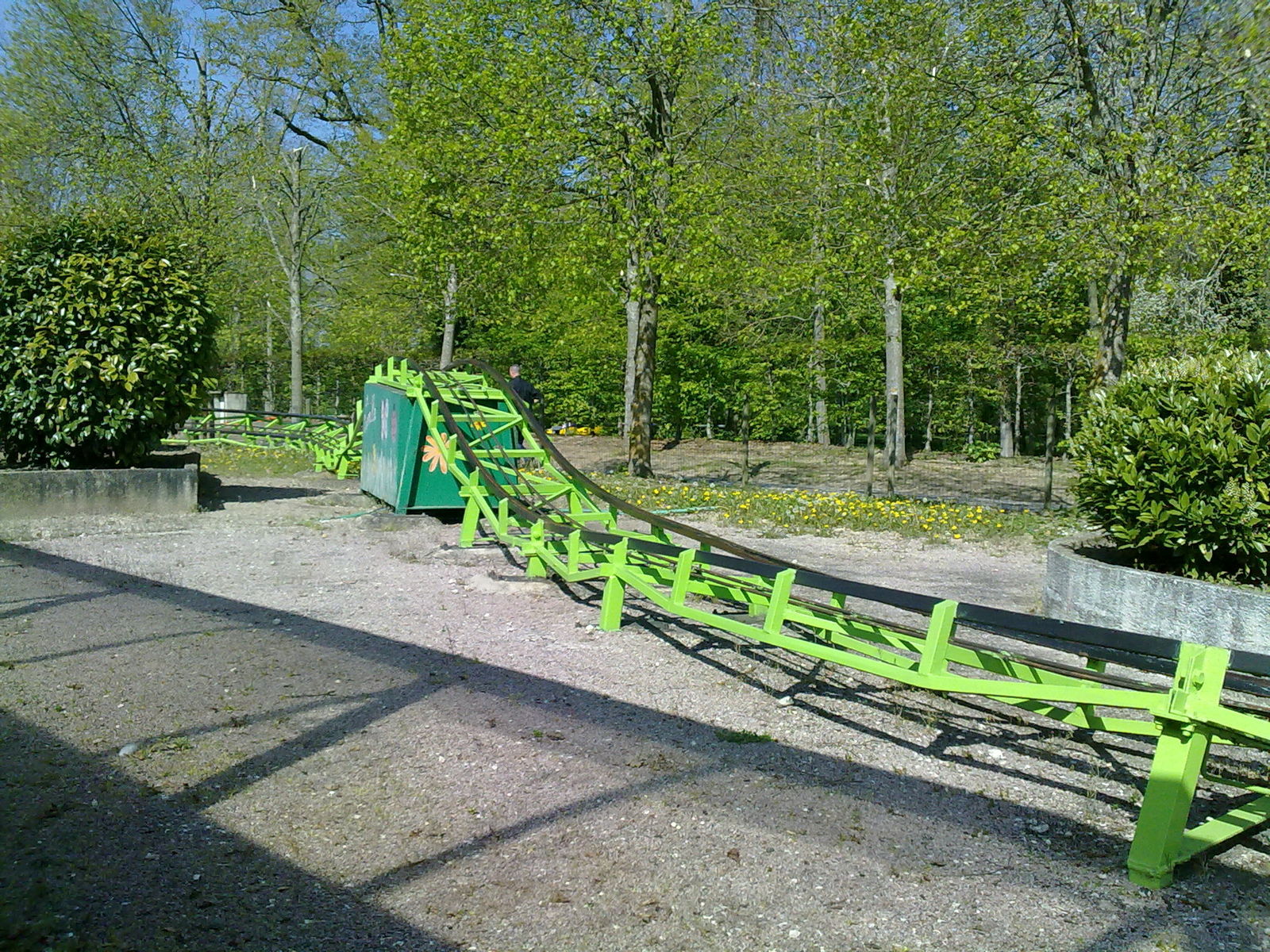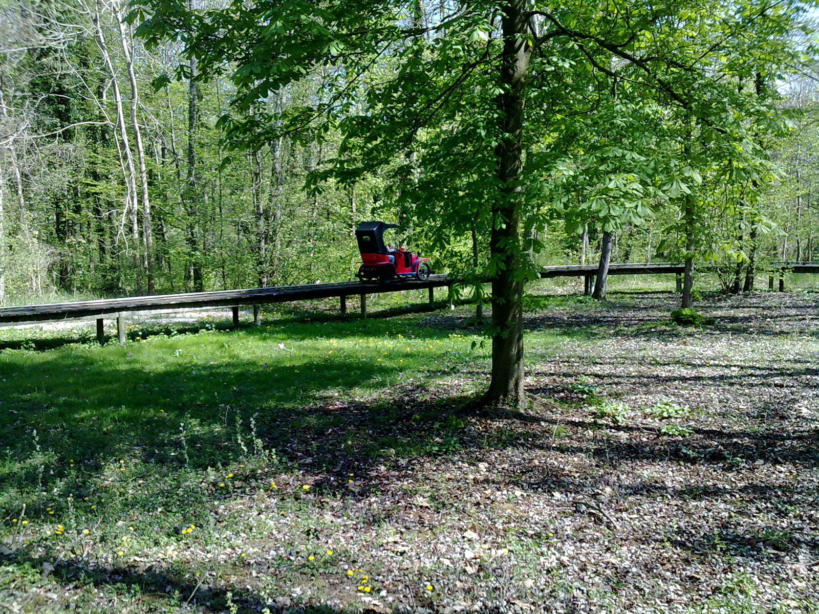 Die Wasserbahn dahinter hatte leider noch geschlossen und so fuhren wir eine Runde auf der Oldtimerbahn. Diese ist wirklich sensationell in den Wald integriert und zum Ausgleich der Unebenheiten im Boden komplett aufgebockt. Alles in allem fand ich den Park sehr angenehm, wenn er auch nicht die Masse an Fahrgeschäften bieten kann.