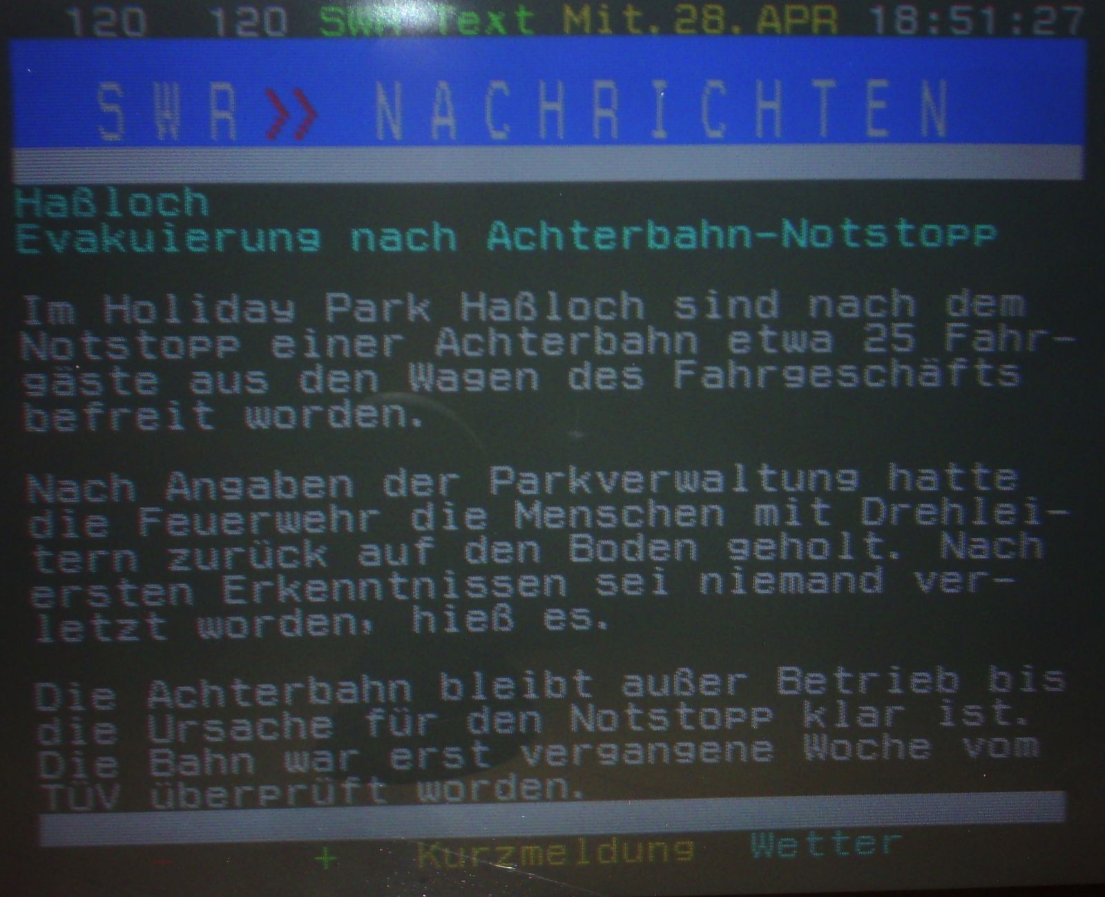 Die Überschrift ist doch mal fesch. "Evakuiert" klingt eh viel besser als nur "Gäste aus ruhendem Achterbahnzug befreit." Was wäre die Park und Kirmesszene nur ohne diese spektakulären Pressemeldungen?