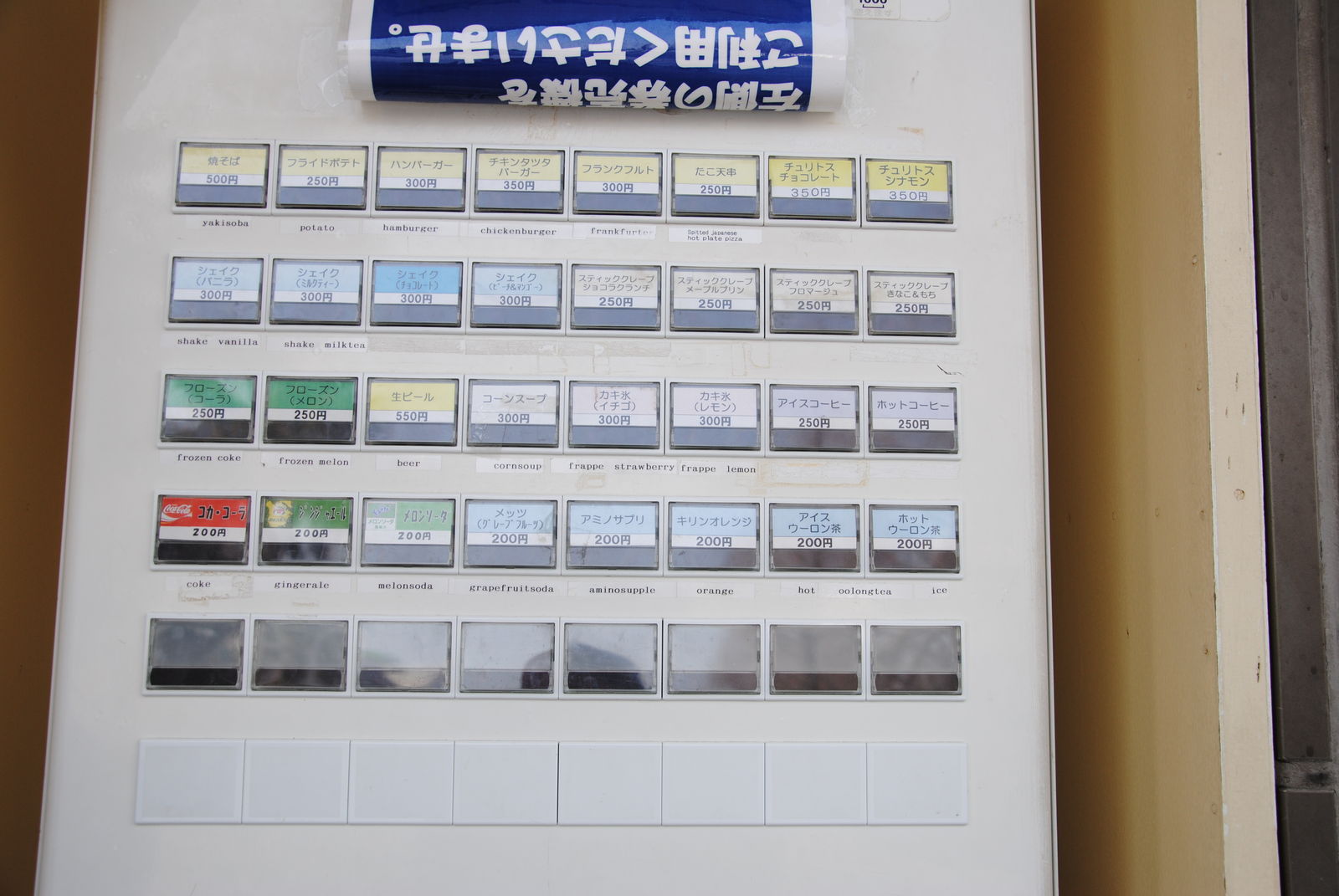 Als Europäer braucht man sich hier übrigens keine Sorgen wegen Verständigungsschwierigkeiten beim Essen kaufen zu machen. Bei den Restaurants gibt es Ticketmaschinen, wo die Speisen auch auf Englisch ausgezeichnet sind!!! Man kauft einen Coupon und gibt diesen bei der Essensausgabe ab, einfacher geht es (in Japan) nicht.