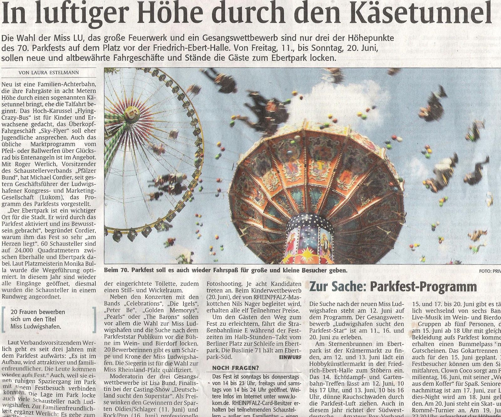 LUKOM Das größte Ludwigshafener Volksfest, das Parkfest, steigt in diesem Jahr vom 11. bis 20. Juni auf dem Festplatz vor der Friedrich-Ebert-Halle. Moderne Fahrgeschäfte sowie ein familienfreundliches Rahmenprogramm sind die Anziehungspunkte. Highlights sind die Wahl der Miss Ludwigshafen und der Gesangswettbewerb Parkfest-Star in drei Kategorien. Am zweiten Wochenende wird ein Höhenfeuerwerk gezündet.