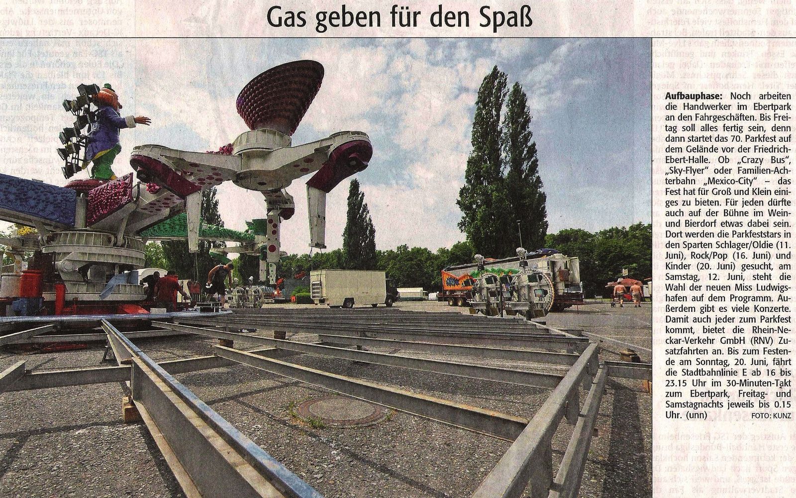 Das 70. Parkfest startet am Freitag, 11. Juni, um 19 Uhr mit einem traditionellen Fassbieranstich im Wein- und Bierdorf Hartinger. Oberbürgermeisterin Dr. Eva Lohse und Marie-Claire Wagner eröffnen Ludwigshafens größtes Volksfest. Unter den Fahrgeschäften sind neben einem Auto-Skooter und einer Geisterbahn Neuheiten wie die Familienachterbahn, der Sky-Flyer, aber auch neue Kinderfahrgeschäfte wie der Flying Crazy Bus und ein barocker Kettenflieger. Weitere Highlights auf dem Festplatz ist die Gokart-Bahn, auf der am Dienstag, 15. Juni, der Wettbewerb „Formel Gokart“ ausgetragen wird. Die Teilnahme ist kostenlos, die Gewinner erhalten einen Siegerpokal. Insgesamt rund 60 Schausteller und Beschicker garantieren einen erlebnisreichen Mix für die ganze Familie. Ein ganztägiger Familientag am Mittwoch, 16. Juni, garantiert Spaß zu vergünstigten Preisen. Ein prachtvolles Höhenfeuerwerk wird am Samstag, 19. Juni, gezündet.