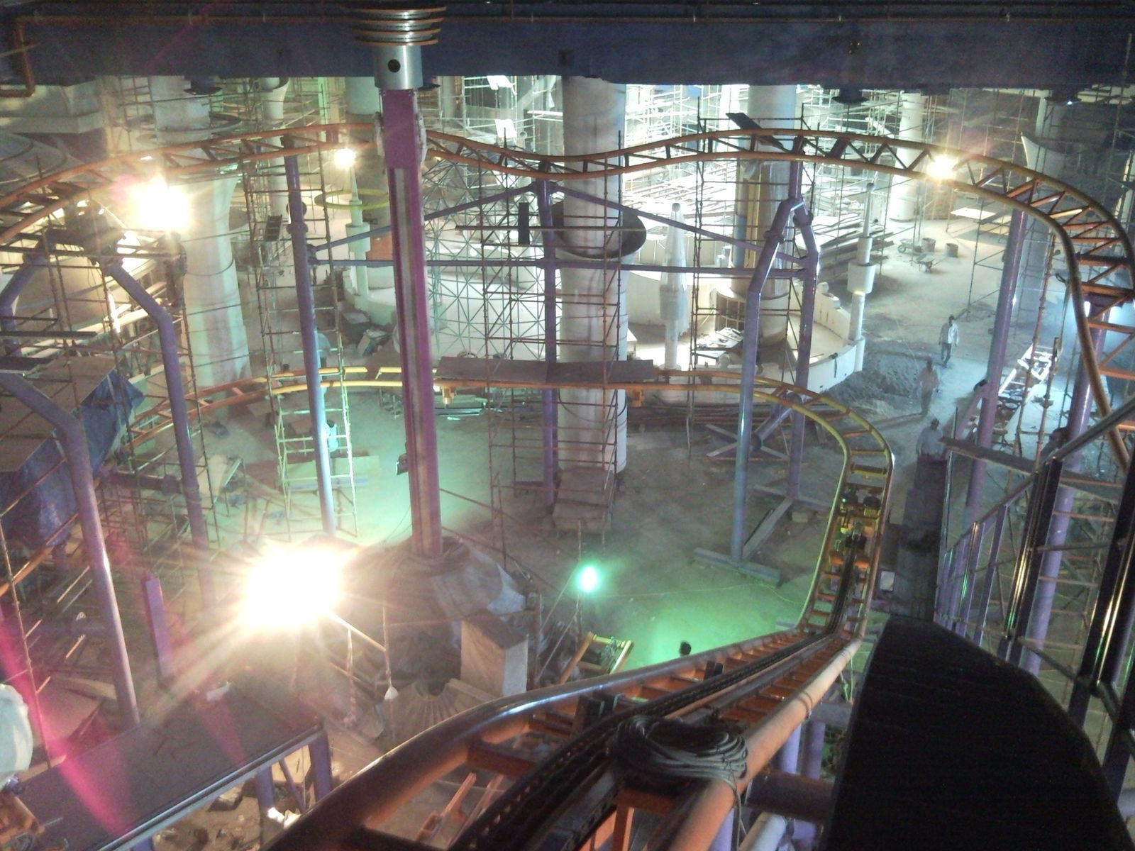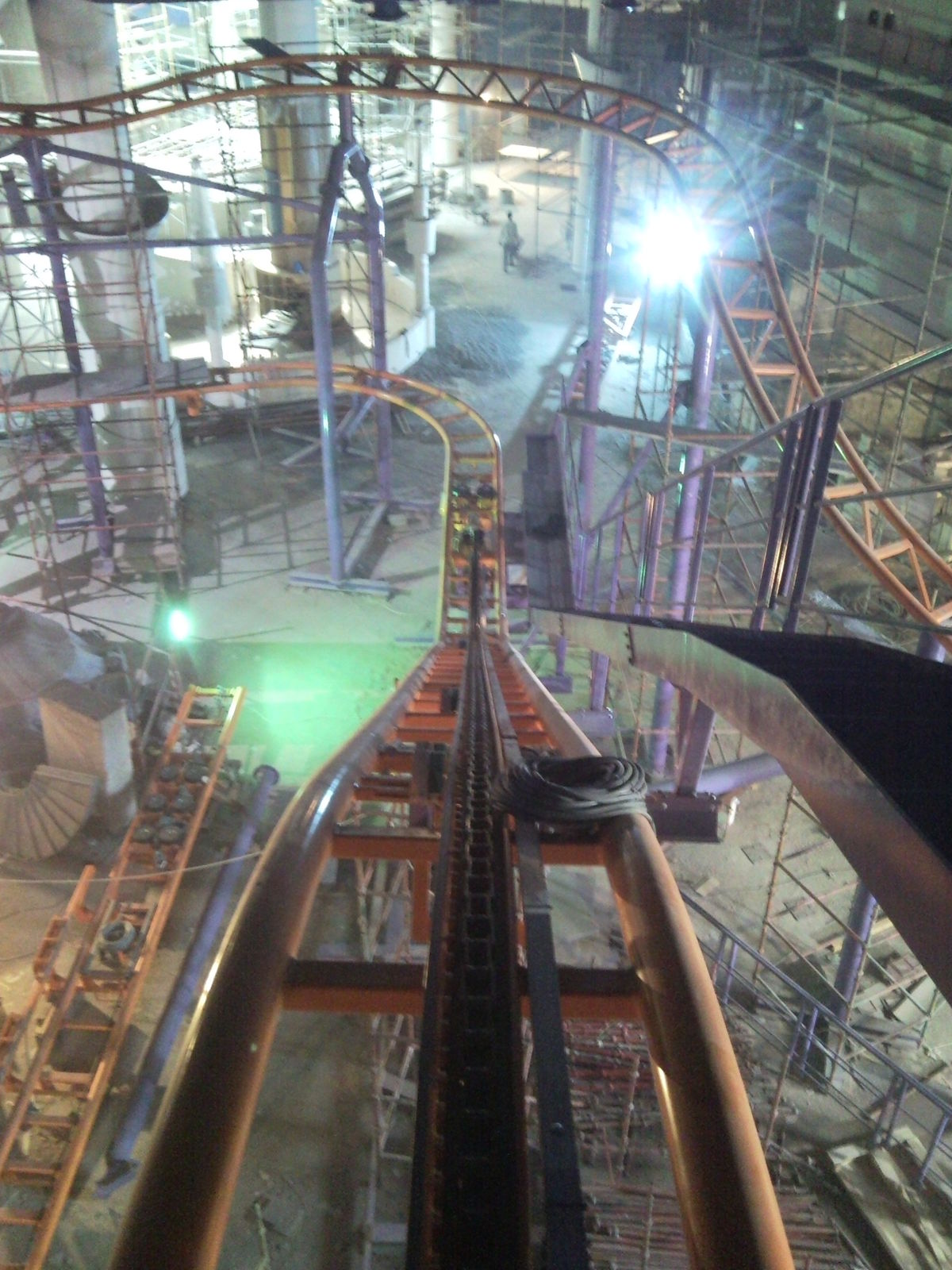 Statt 360 Coaster hätten die das Dingen auch Vampire Coaster nennen können. Denn ab diesem Loch ist es vorbei mit Tageslicht, hier geht es wieder runter auf die Montage Ebene. Die Indoor Loacation spart damit jegliche Lackierungskosten, welche bei der brutalen Sonne sonst sicherlich jedes Jahr fällig wären.