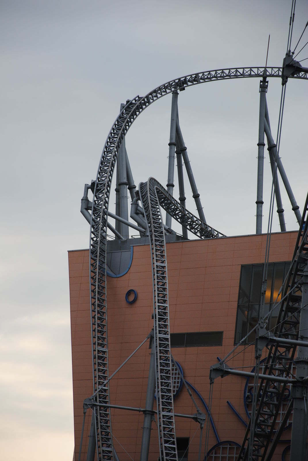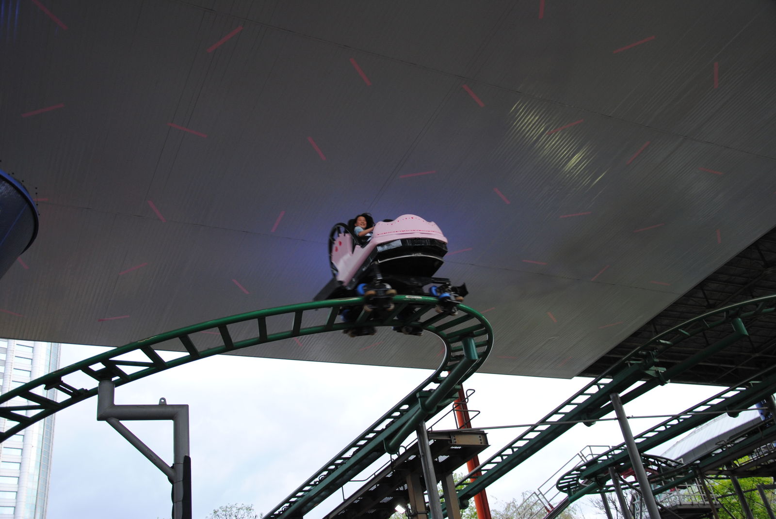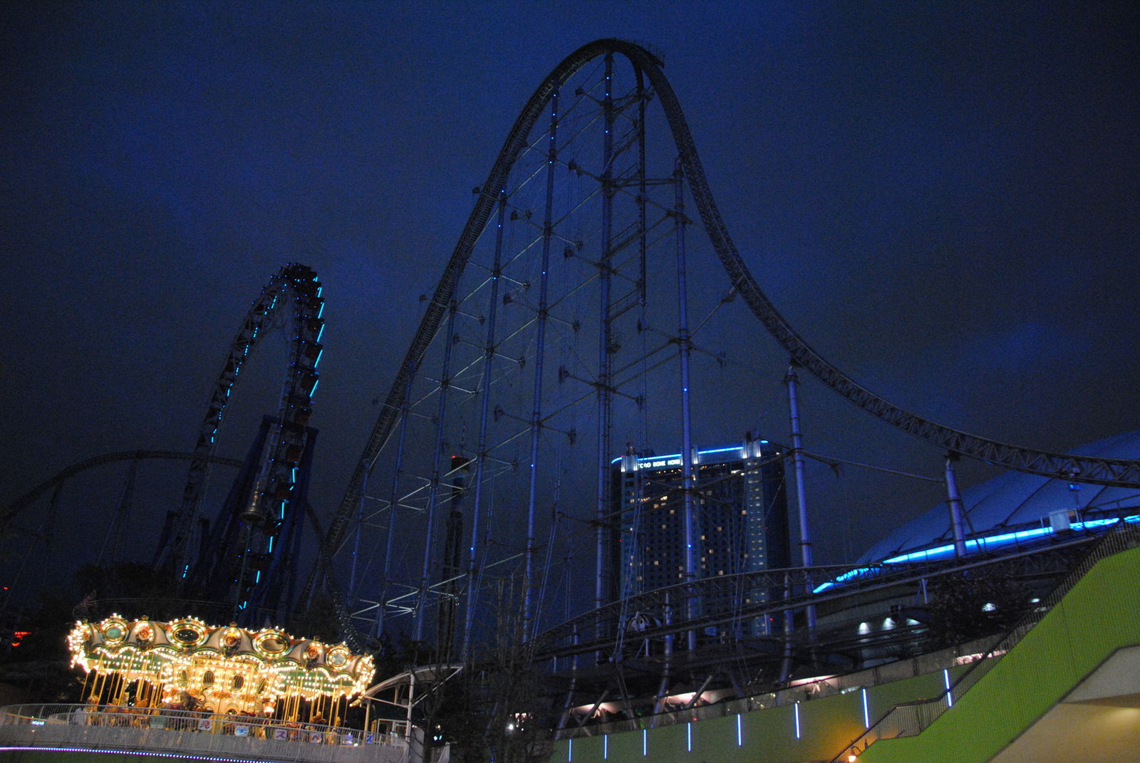 Das Highlight in der Dome City ist Thunder Dolphin, ein Mega Coaster mit einmaliger Kulisse, darunter die bekannte Fahrt durch ein Hochhaus und das innere des Riesenrads Big-O, welches aber bei unserem Besuch wegen Wartungsarbeiten geschlossen war. Thunder Dolphin war noch einmal ein richtiger Höhepunkt auf unserer Japan-Tour. Höhe, Geschwindigkeit und die Kulisse der Bahn machen die Fahrt zu einem besonderen Erlebnis, besonders wenn abends die bunten Lichter von Tokyo angehen. Das Layout der Bahn ist genauso einfach wie genial. Im Prinzip wechseln sich schnelle Auf- und Abfahrten mit Rechtskurven ab. Eigentlich hat die Bahn vor der Schlussbremse noch so viel Energie, um noch viele weitere Schienemeter zu absolvieren, was aber der Platzmangel nicht zulässt. Einziges Manko ist, dass es keine