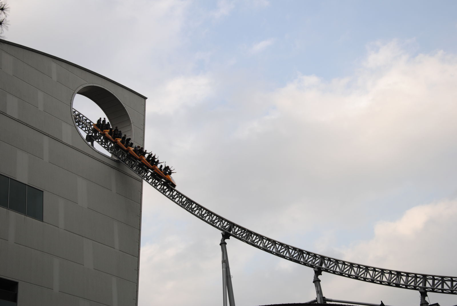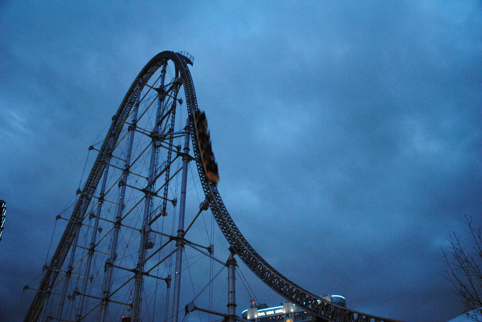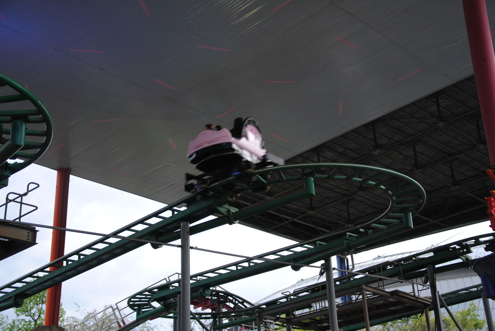 Das Highlight in der Dome City ist Thunder Dolphin, ein Mega Coaster mit einmaliger Kulisse, darunter die bekannte Fahrt durch ein Hochhaus und das innere des Riesenrads Big-O, welches aber bei unserem Besuch wegen Wartungsarbeiten geschlossen war. Thunder Dolphin war noch einmal ein richtiger Höhepunkt auf unserer Japan-Tour. Höhe, Geschwindigkeit und die Kulisse der Bahn machen die Fahrt zu einem besonderen Erlebnis, besonders wenn abends die bunten Lichter von Tokyo angehen. Das Layout der Bahn ist genauso einfach wie genial. Im Prinzip wechseln sich schnelle Auf- und Abfahrten mit Rechtskurven ab. Eigentlich hat die Bahn vor der Schlussbremse noch so viel Energie, um noch viele weitere Schienemeter zu absolvieren, was aber der Platzmangel nicht zulässt. Einziges Manko ist, dass es keine