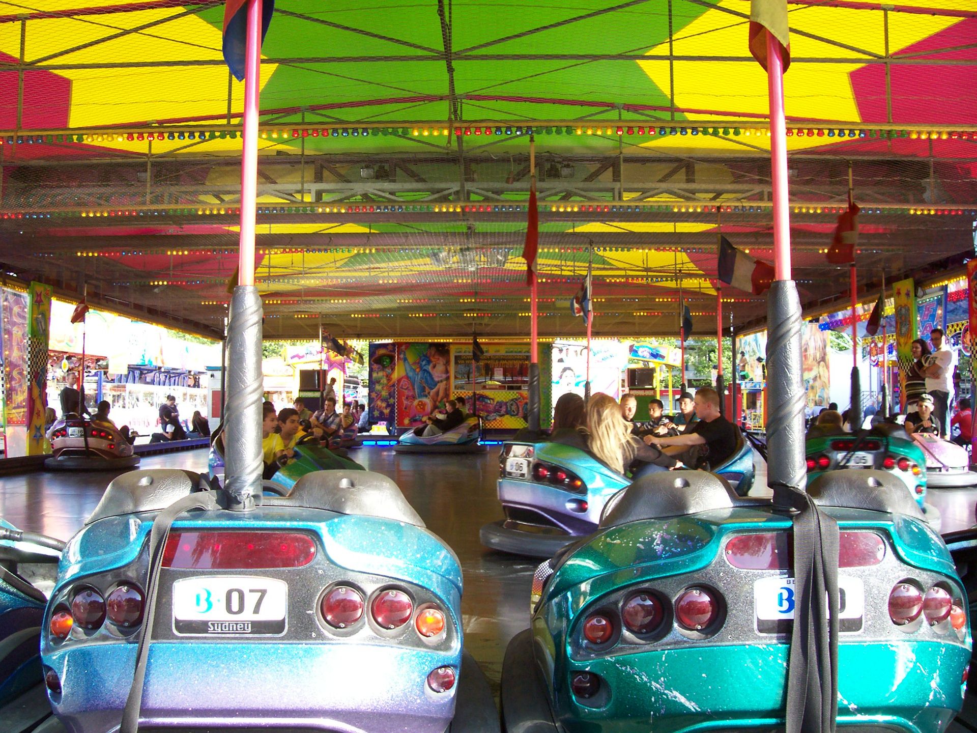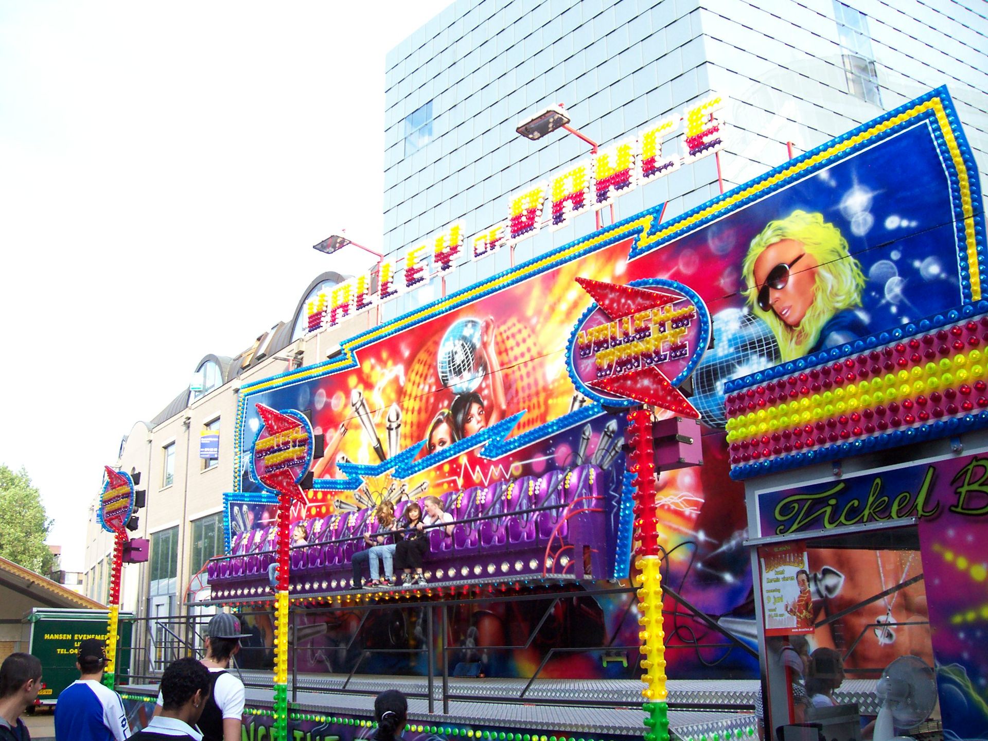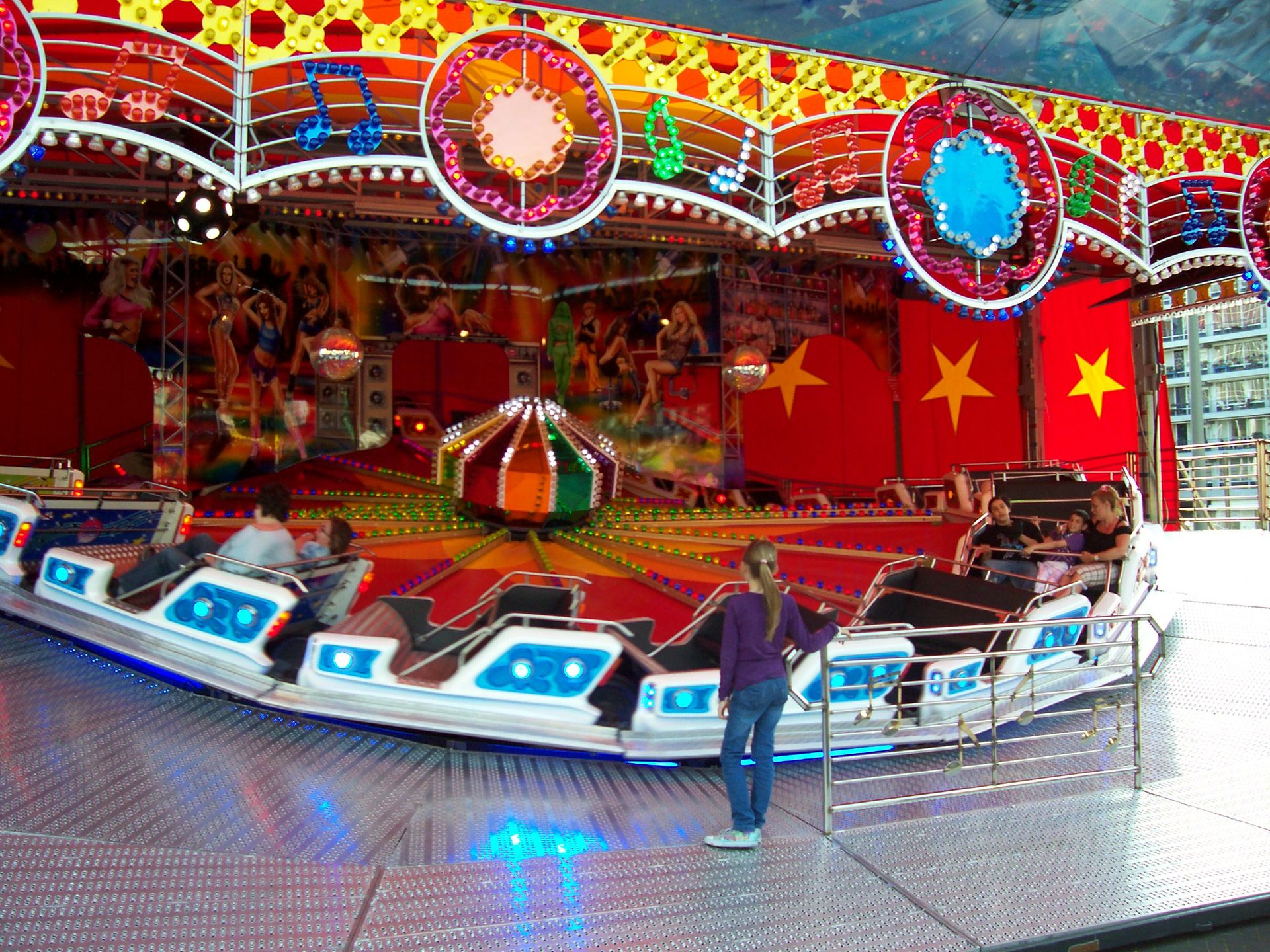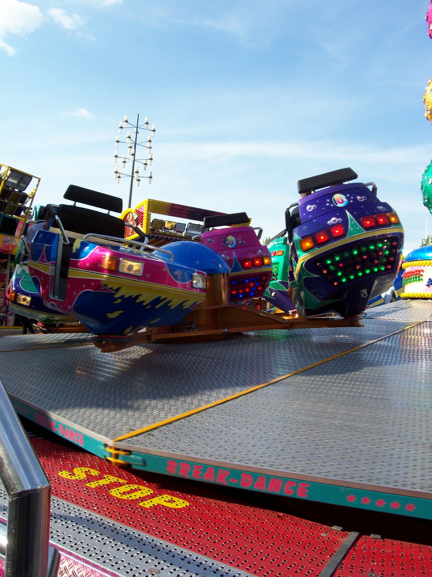 Los geht es mit dem ersten Platz. Hier gab es das 4-D Kino "4-D Vision", einen Break Dance, der Musikexpres "Discostar", ein Autoscooter, "Rock It", und das Fun House "Fire Department" zu sehen.