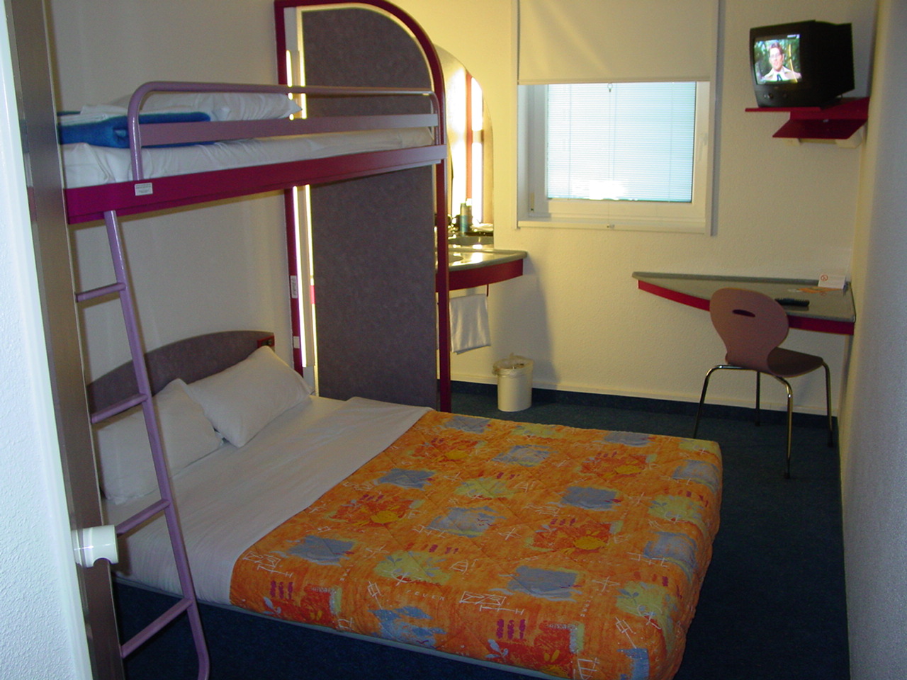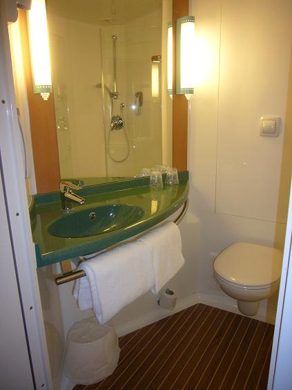 Etap Hotels haben meistens eine Vollplastiknasszelle. Sprich kein Klodeckel und eine fest montierte Duschbrause. Dusche und WC sind aber getrennt. das Waschbecken befindet sich dann im Zimmer selbst und nicht in der Nasszelle. Es gibt aber, gerade auch in Frankreich, noch ältere Etap Hotels, welche dann auch über ein normales, wenn auch sehr kleines Bad verfügen. Ebenfalls anders als in den Ibis Hotels sind die Betten. In den Etap Hotels findet man immer ein Doppelbett mit einem als Hochbett quer drüber hinweg ausgeführten Einzelbett. Allgemein gibt es im Zimmer kaum Ausstattung neben Bett und TV. Mir reicht das in den meisten Fällen aber vollkommen.