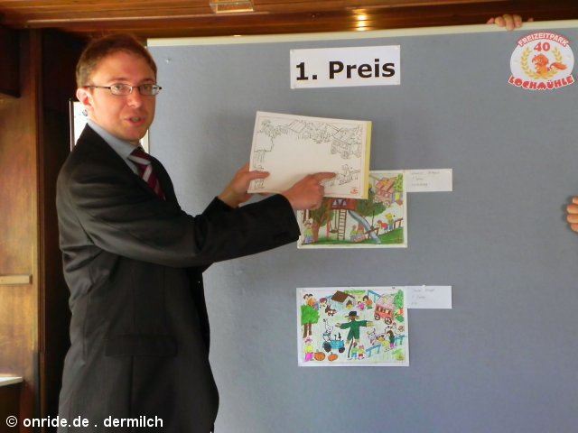 In Wehrheim traf sich heute Vormittag die Wettbewerbs-Jury, um die besten Arbeiten des Lochmühle-Malwettbewerbs auszuwählen. Insgesamt 1.096 Kinder haben seit Mitte März ihre selbst gemalten Bilder an die Lochmühle geschickt oder persönlich im Park abgegeben. Die Teilnehmer hatten die Aufgabe, ein teilweise vorgegebenes Ausmalbild des Frankfurter Cartoonisten Klaus Puth weiterzuentwickeln. Die Szenerie zeigte einen Bauernhof mit dem Parkgründer Theo Zwermann am Bildrand.