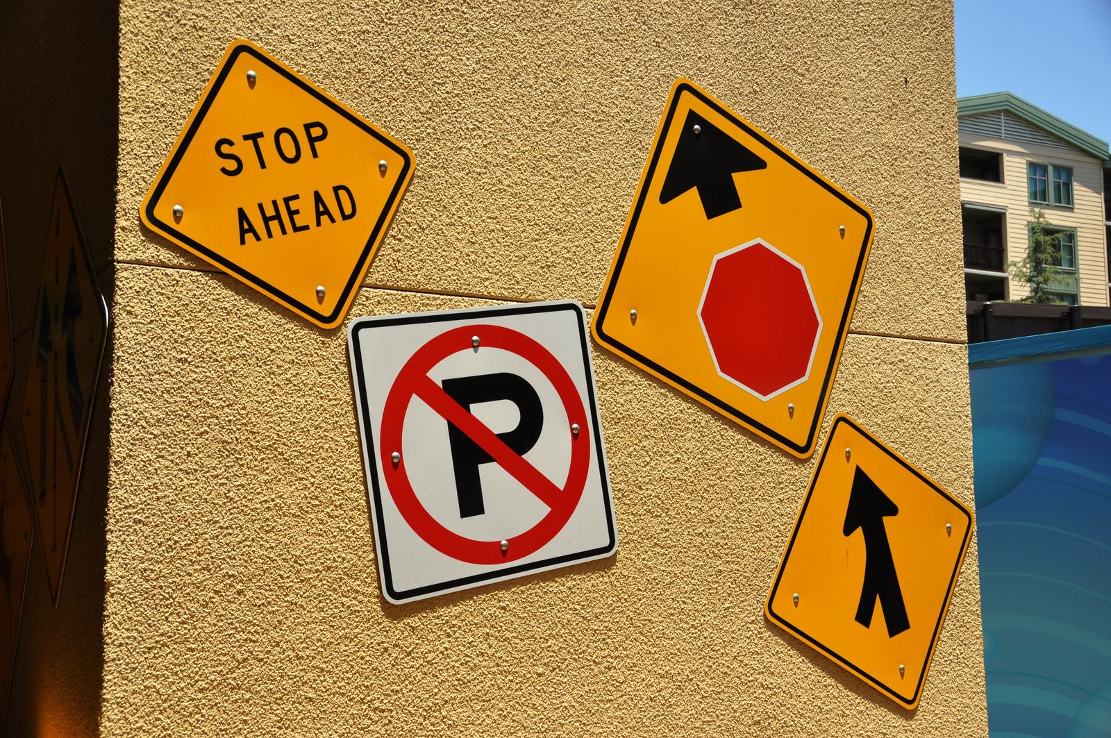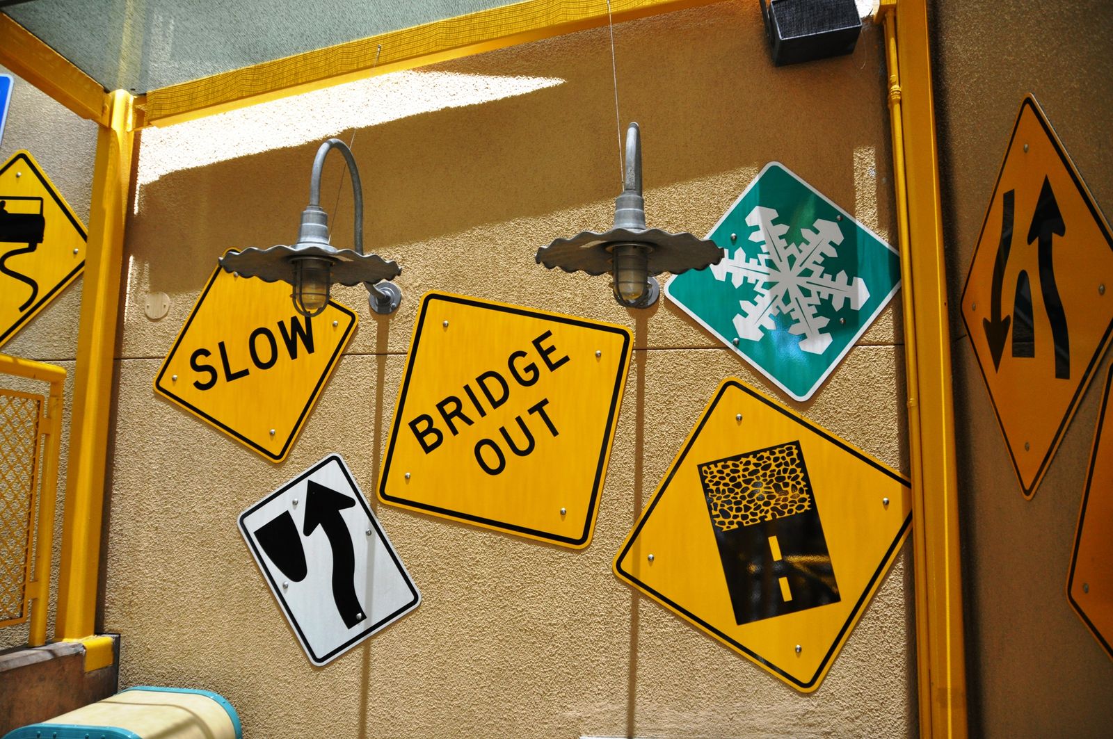 Ausserhalb der Fahrt wirken die vielen direkt an der Strecke angebrachten Schilder - ein merkwürdiger Versuch von Theming - eher störend und passen überhaupt nicht in das Gesamtbild des Parks.