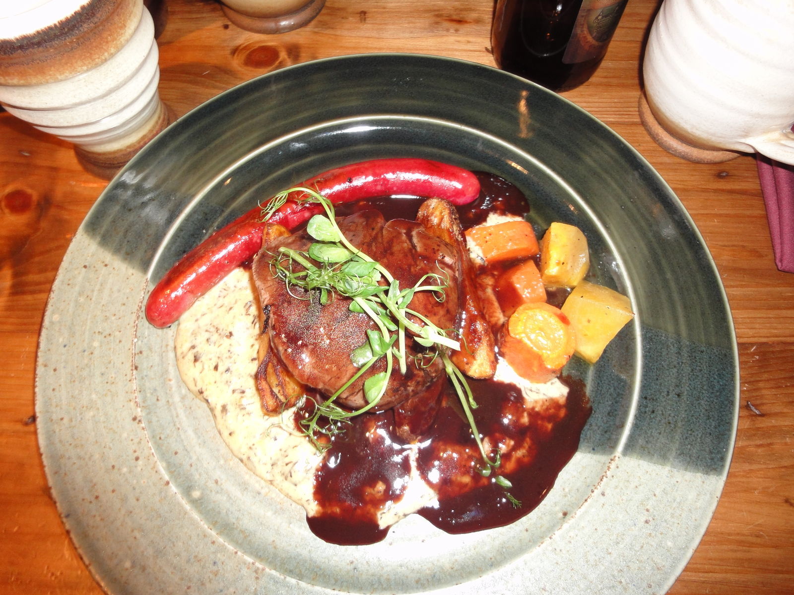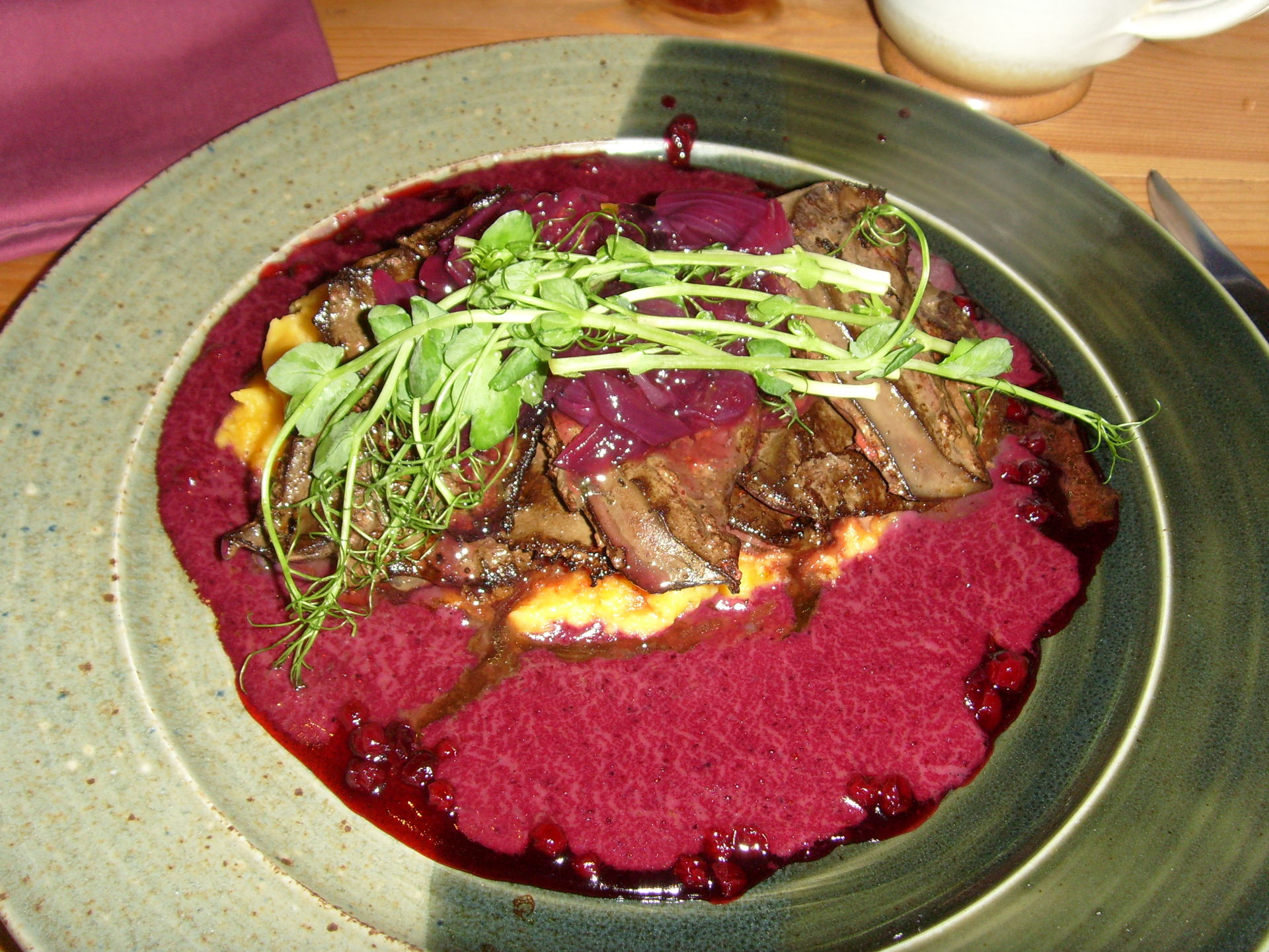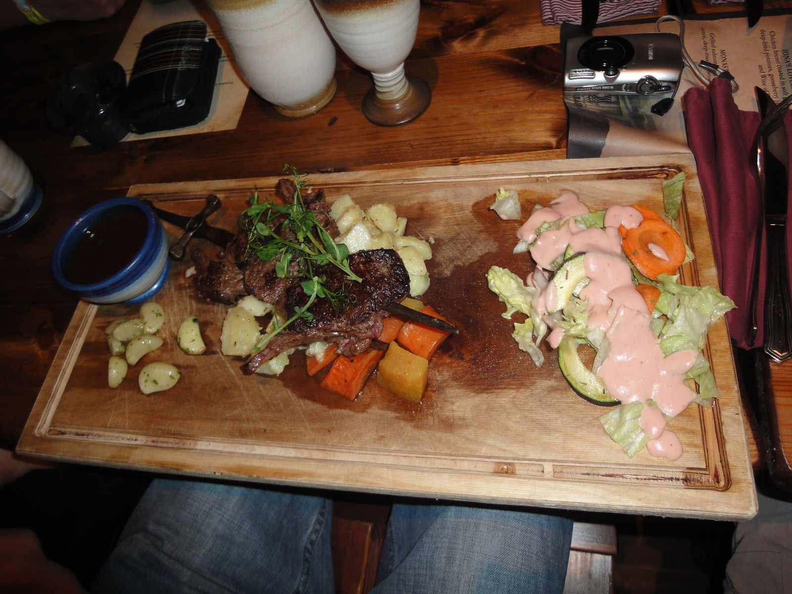 Essen 2: Rentierfilet, extra blutig bestellt, superlecker und zart, Fleisch war perfekt abgehongen, dazu noch eine Rentierwurst. Lecker.