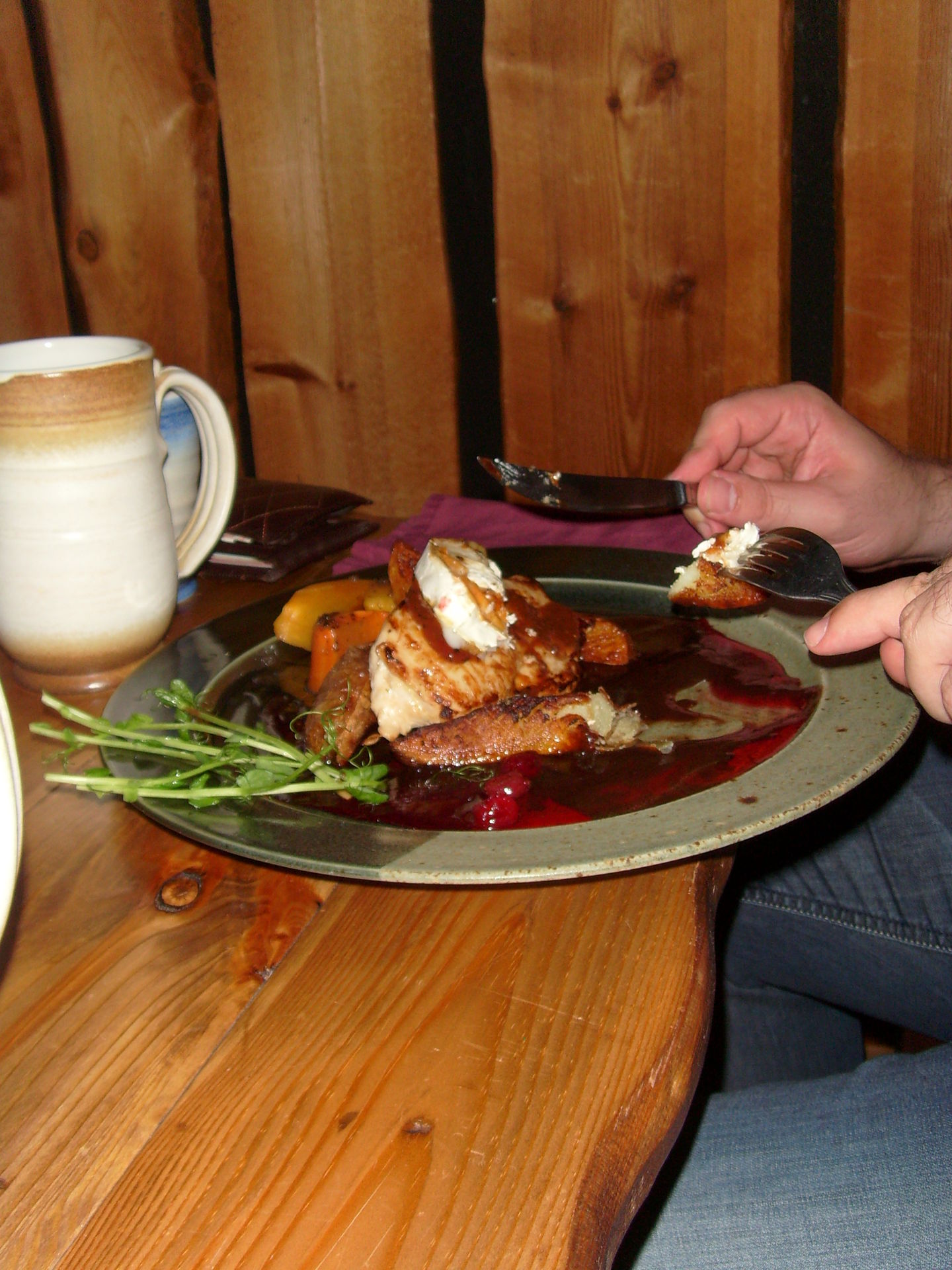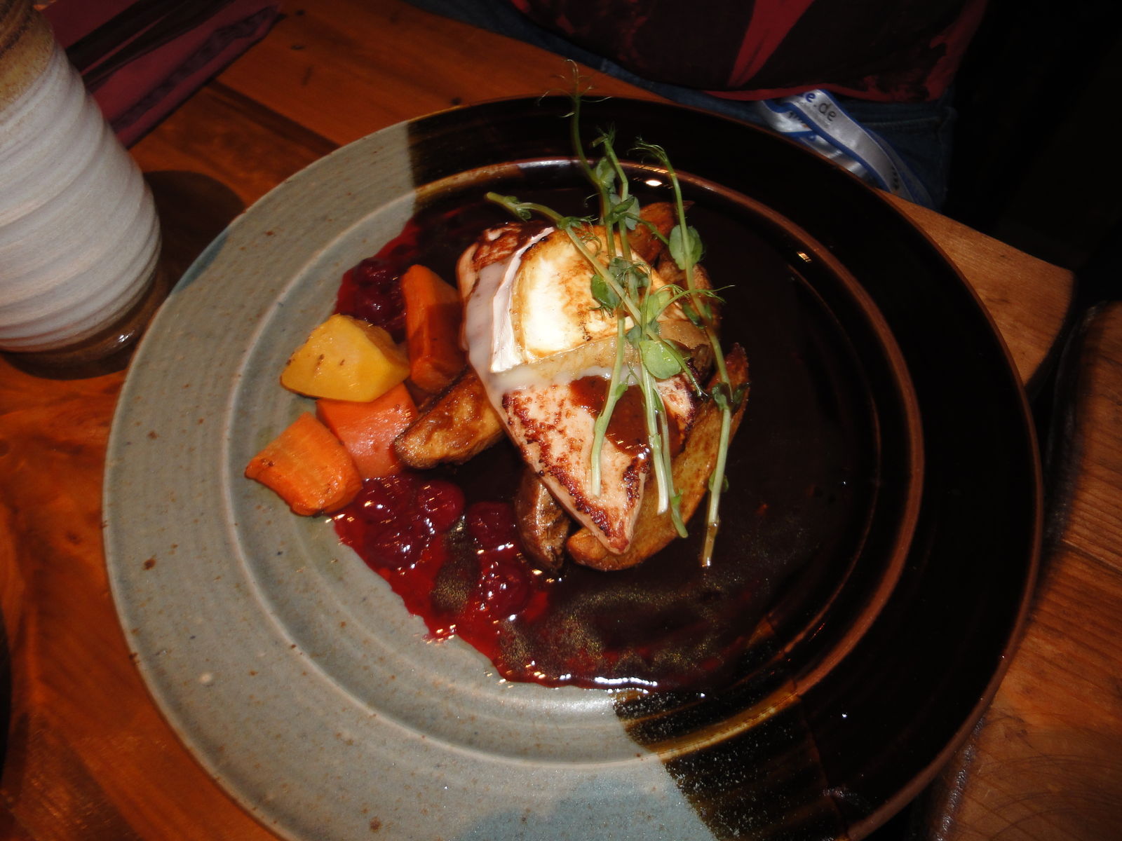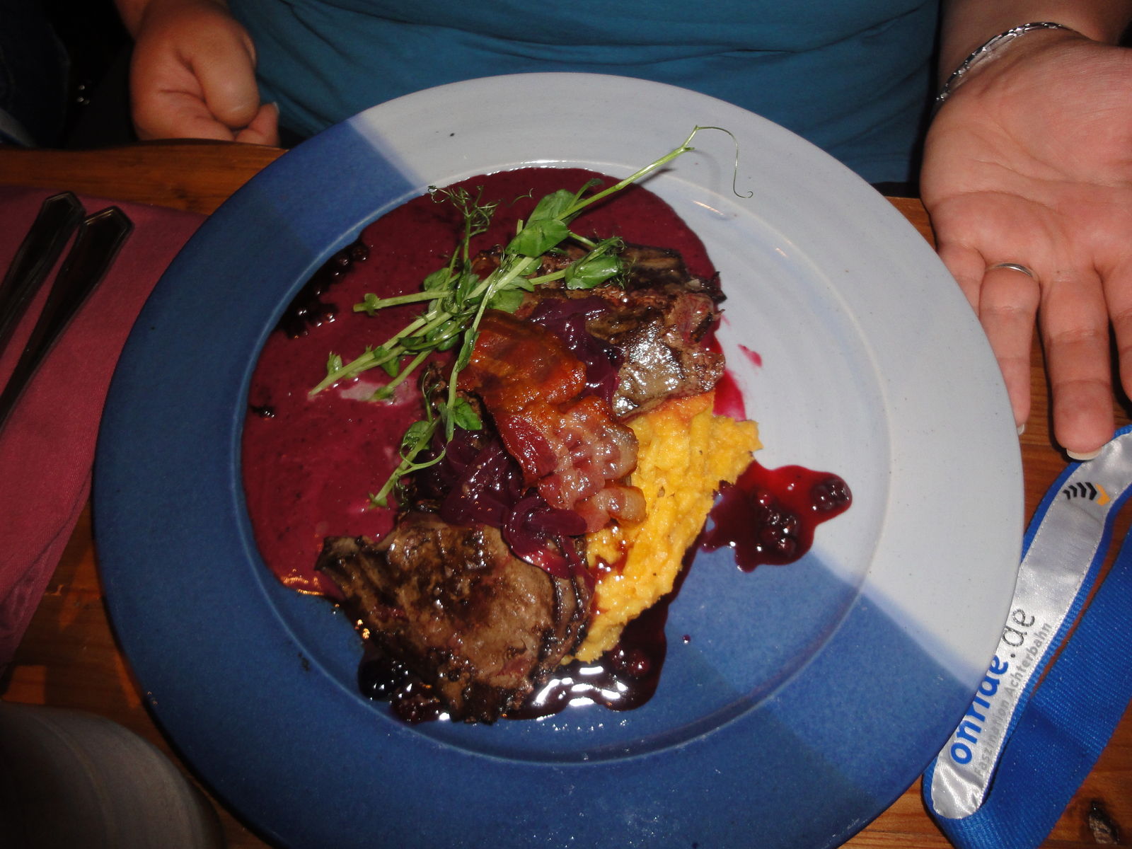Essen 4: Irgendwas mit Hühnchen und Ziegenkäse, aber das Highlight daran war die Soße, haben doch etliche gegessen.