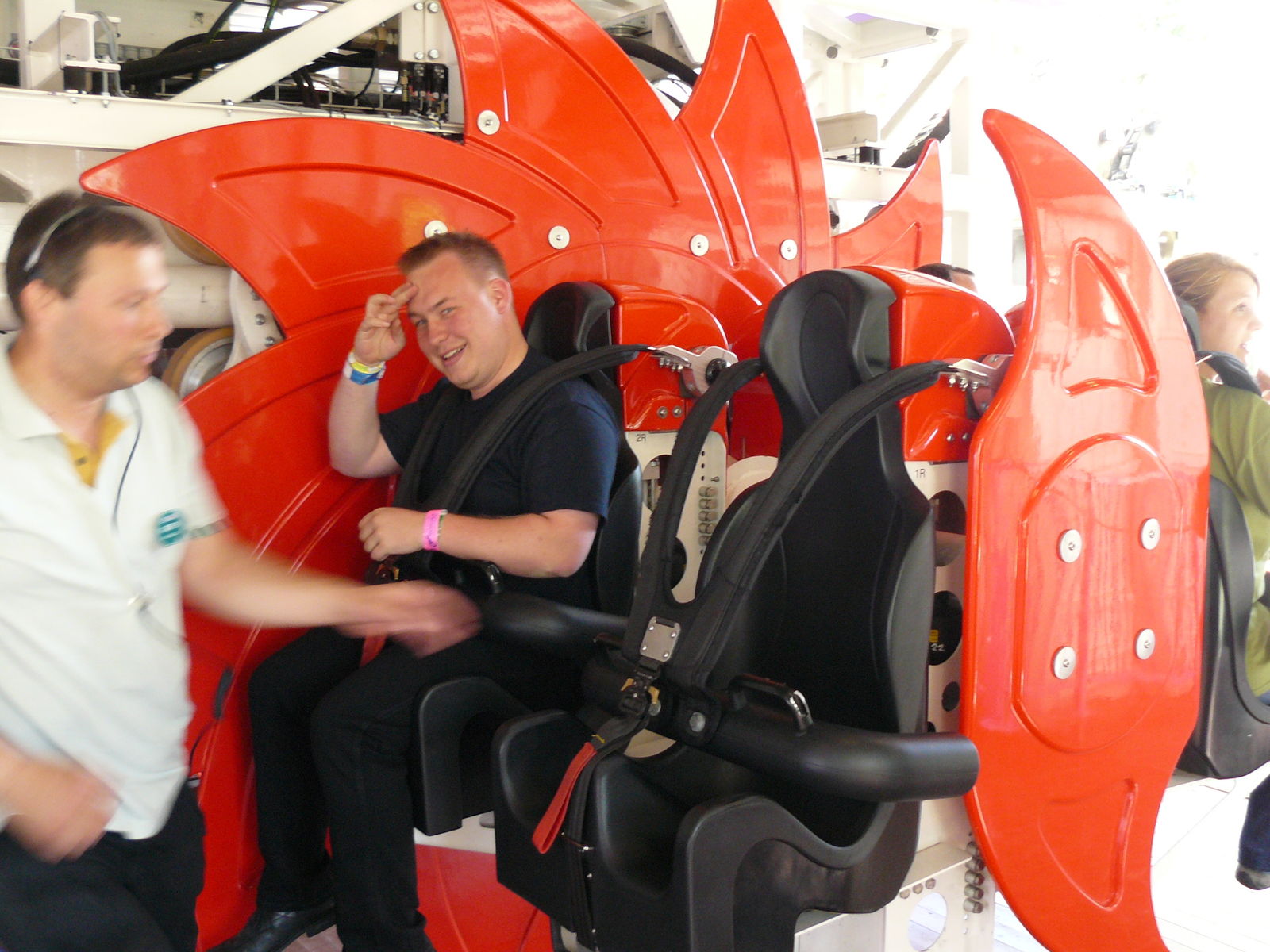...und tapste danach geschlossen zum Wahnsinn des Tages. Wortwörtlich, denn mit Insane stand nun eine oFT auf einer Bahn an, die ihren Namen wirklich zu recht trägt. Mir jedenfalls, der ich von der zu kurzen Nacht noch nicht ganz fit war, knipste gleich die erste Fahrt in Normalbesetzung kurzzeitig das Licht aus und sorgte dafür, dass das Hirn danach noch ein paar Minuten brauchte, um den Rückweg vom Orbit um den Mars zu finden.