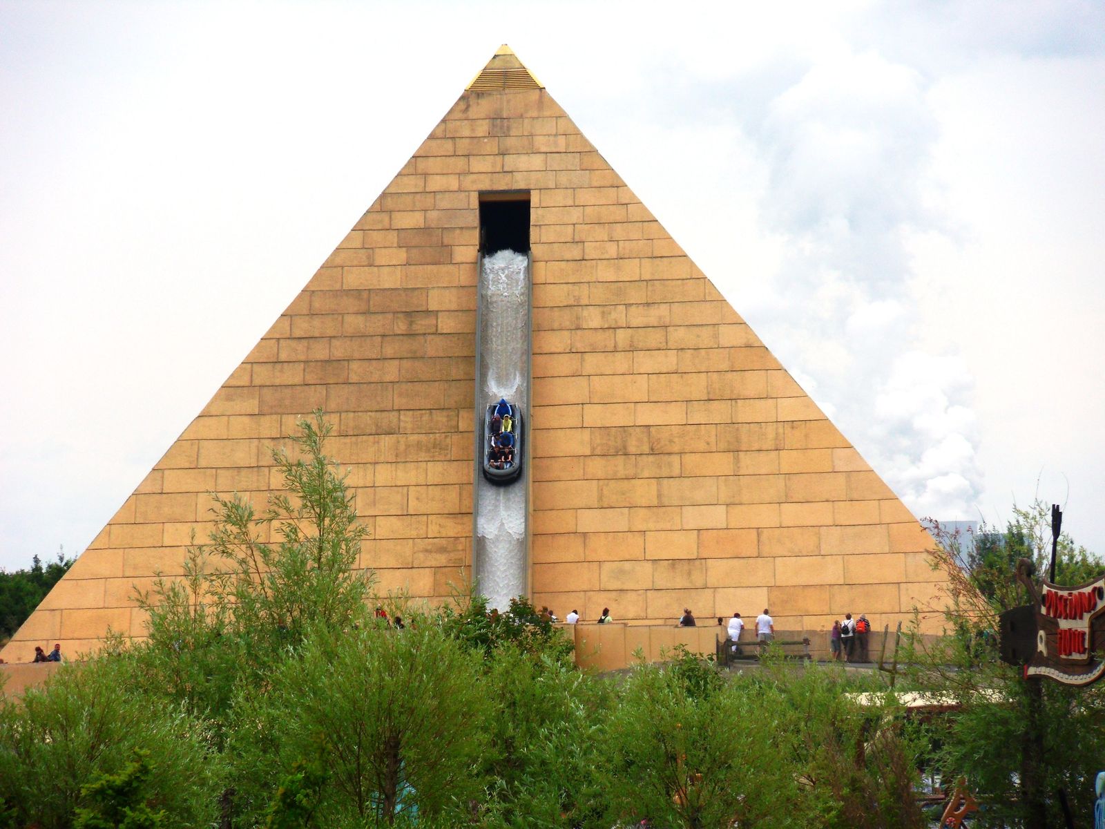 Hinter diesem mehr oder weniger gelungenem Namen versteckt sich eine Wildwasserbahn. Wobei „verstecken“ eigentlich nicht das richtige Verb ist, denn die Wildwasserbahn ist von überall gut zu sehen und die Pyramidenspitze bildet den höchsten Punkt von Belantis.