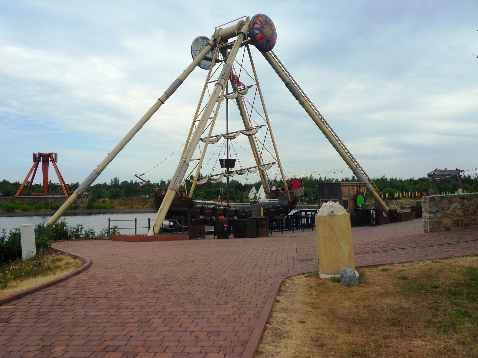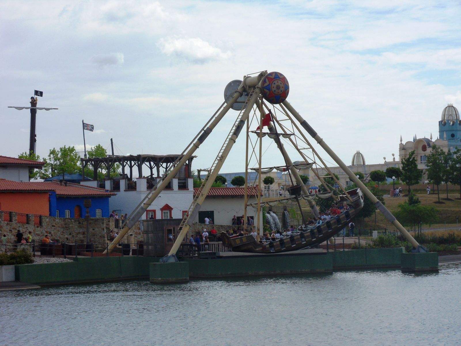Von einem kleinen Hügel hat man beste Sicht auf die Küste der Entdecker- und deren Hauptattraktion: Die Riesenschiffschaukel Santa Maria.