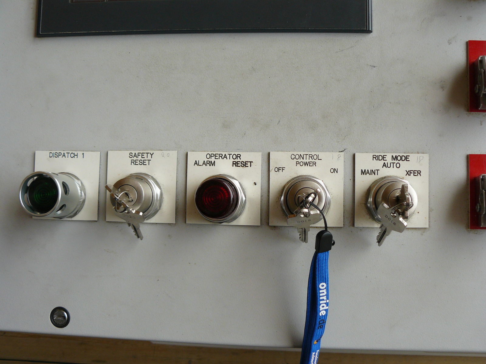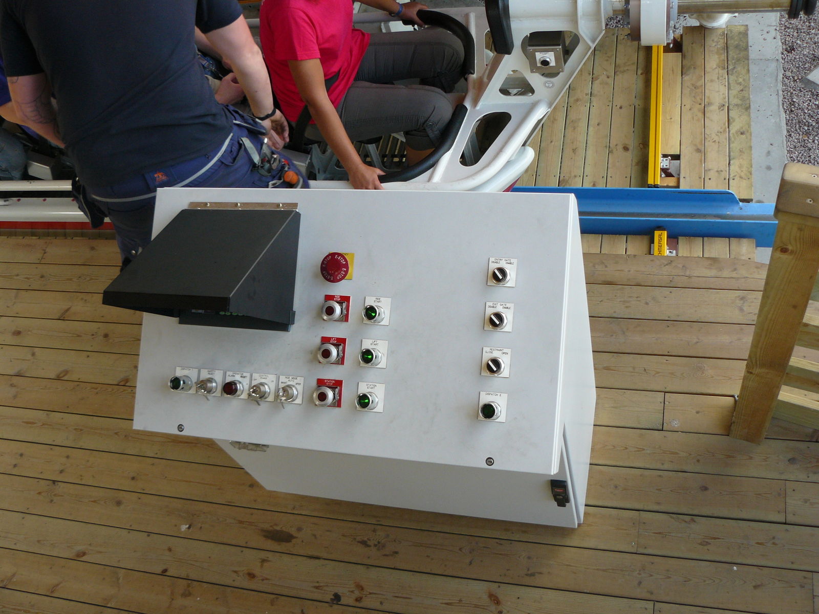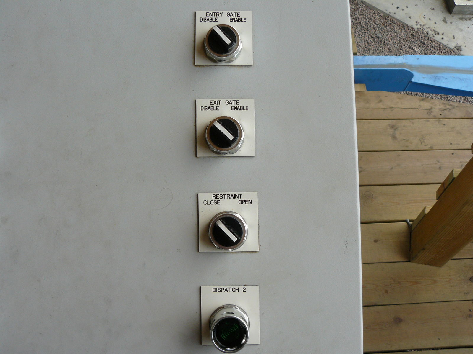 Start des Zuges, muss zusammen mit Dispatch 3 und 4 gedrückt werden. 3 befindet sich am kleinen Pult rechts in der Station, 4 Links. Es müssen also alle 3 Operatoren zusammen die Startfreigabe geben. Ist wie oben beschrieben das rechte Operatorpult überbrückt, muss dispatch 2 auf dem Hauptpult gedrückt werden anstelle von dispatch 3. Somit kann ein operator gespart werden, was im normalen Gästebetrieb aber nicht gemacht wird.