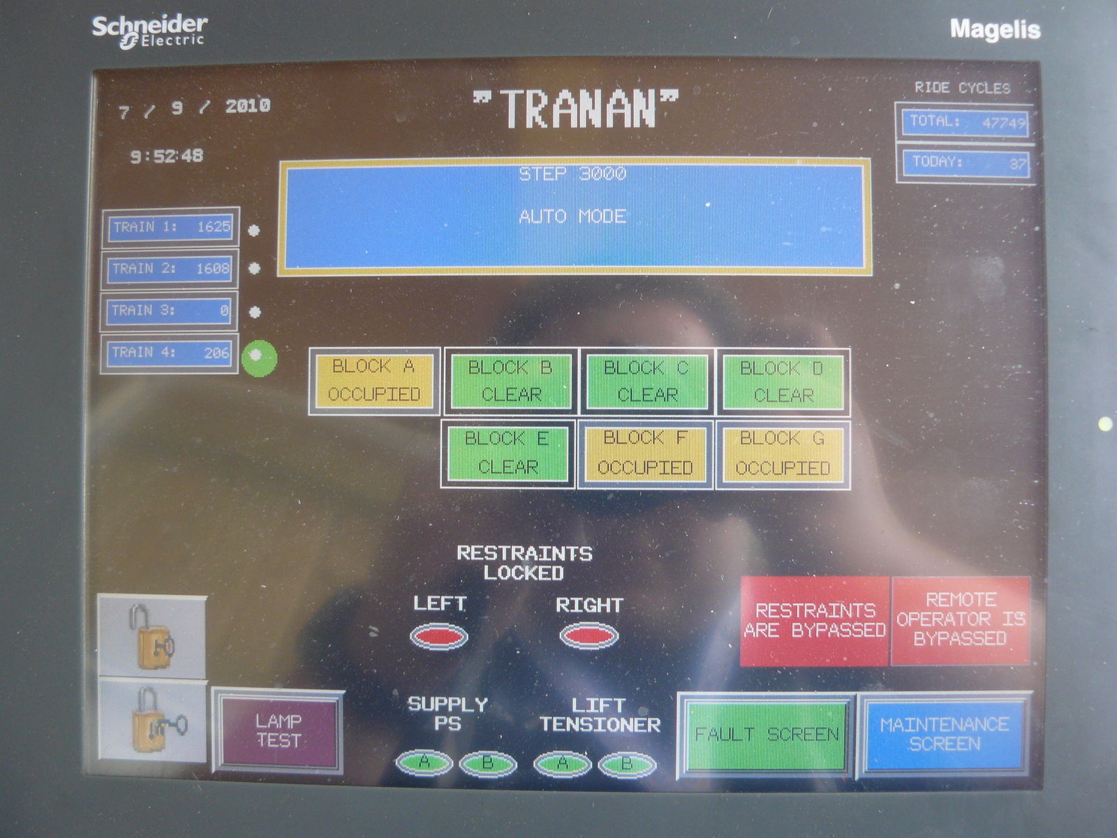 Auf dem Foto befand sich Zug 4 -der in der Rundenanzeige mit der grünen Markierung- im Lift, die anderen beiden waren innerhalb der Station gerade bis vorne aufgerückt. Zug 3 stand auf dem Abstellgleis.