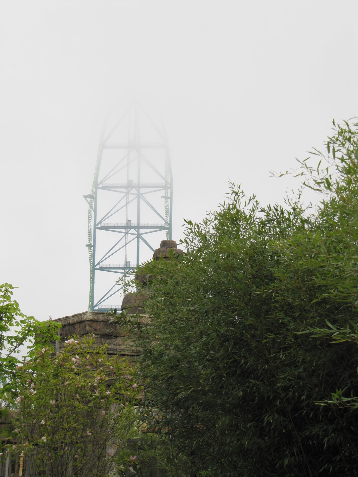 Durch die Regenwolken verschwand die Spitze Kingda Ka's teilweise komplett. Der Anblick hat schon was.