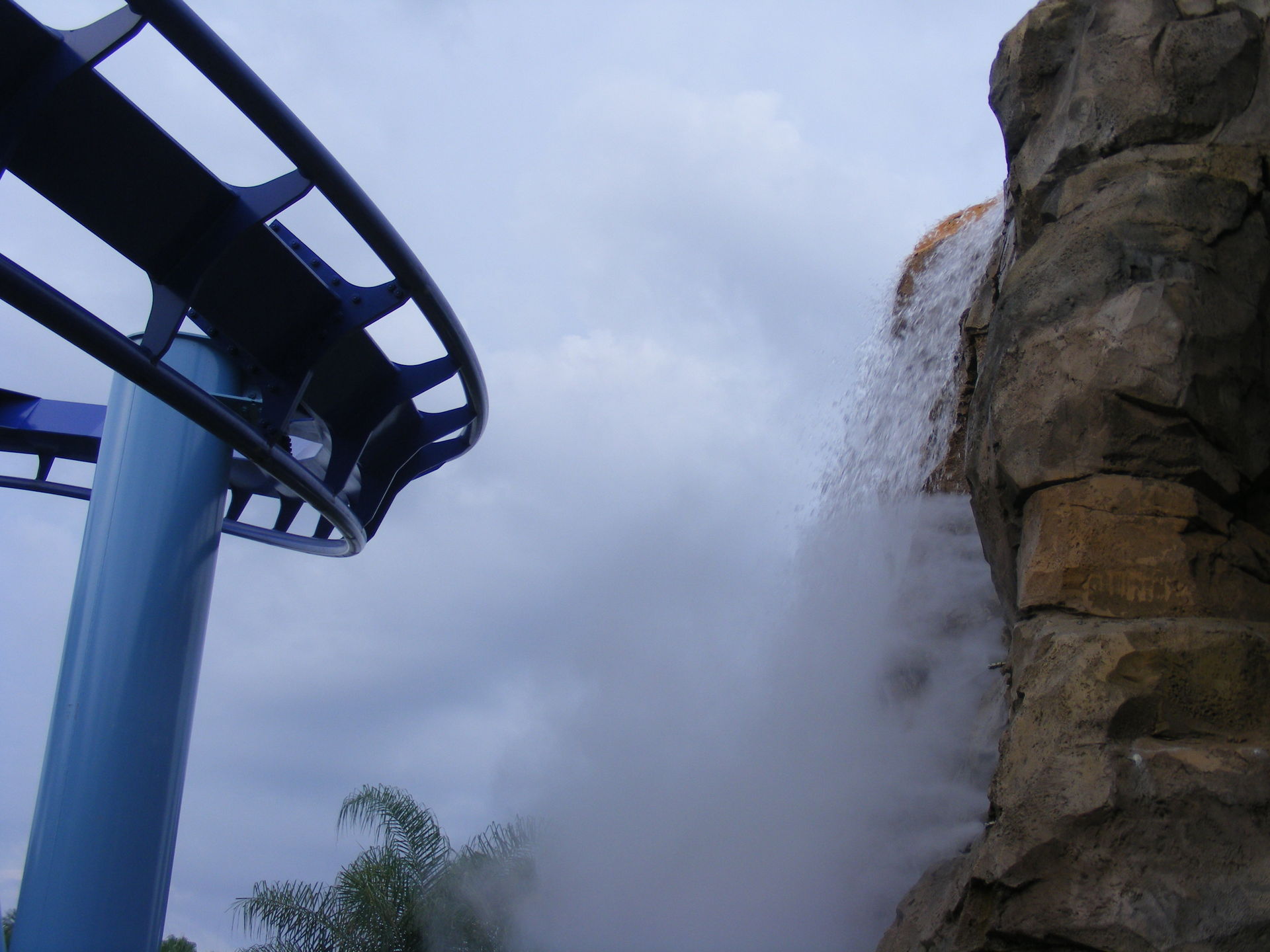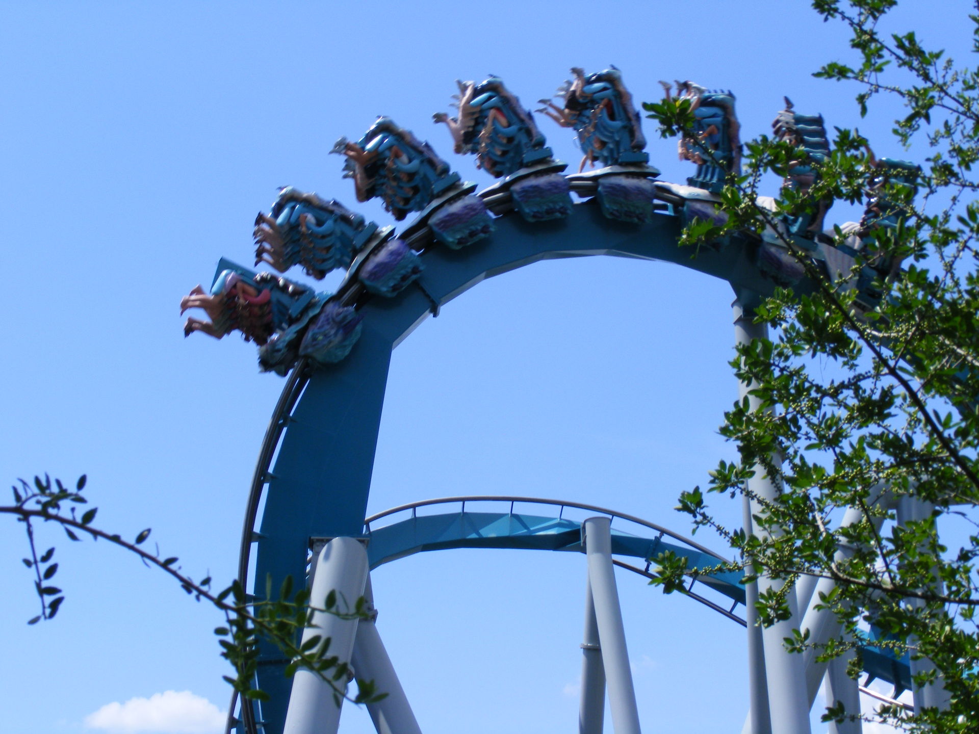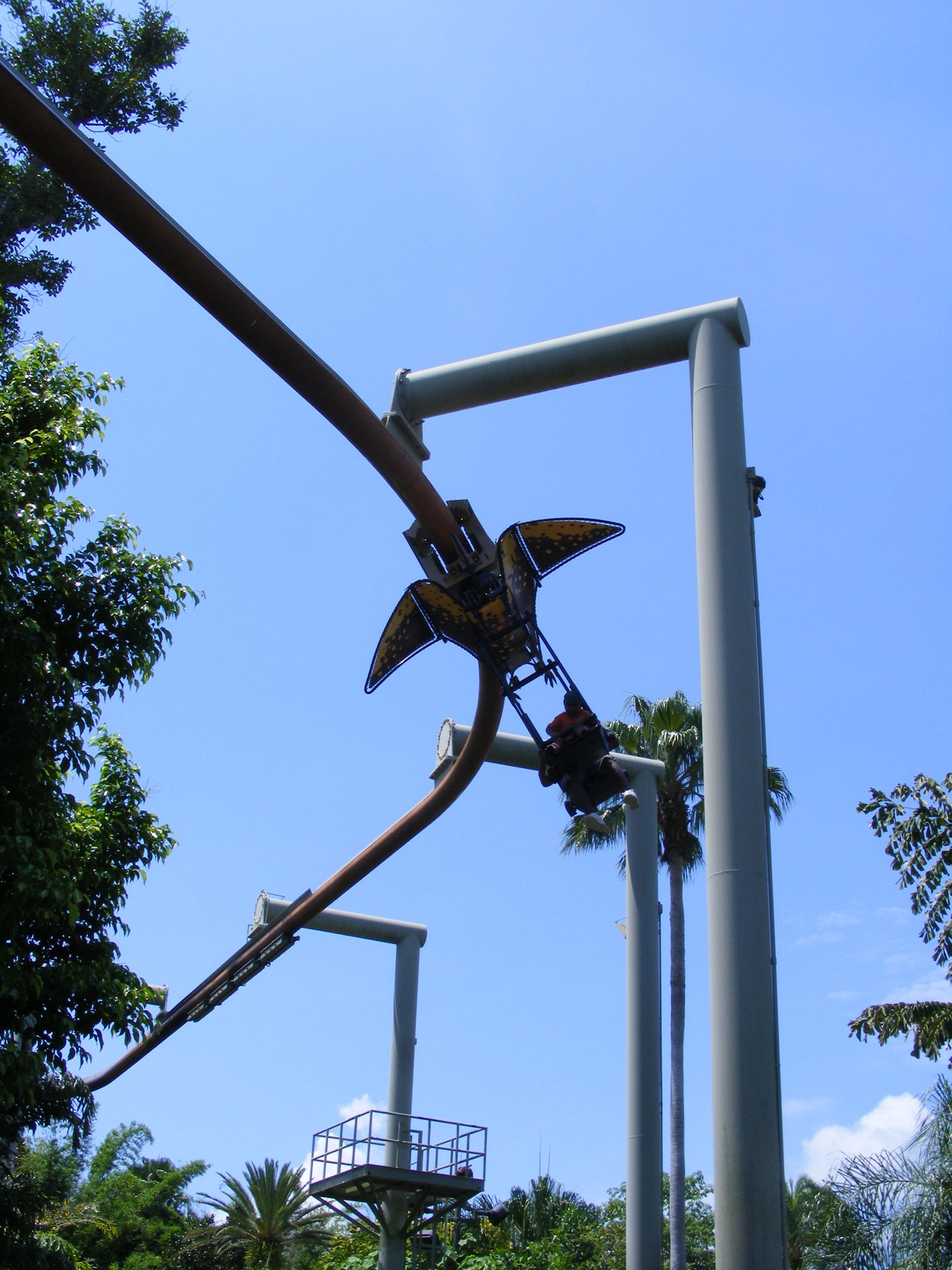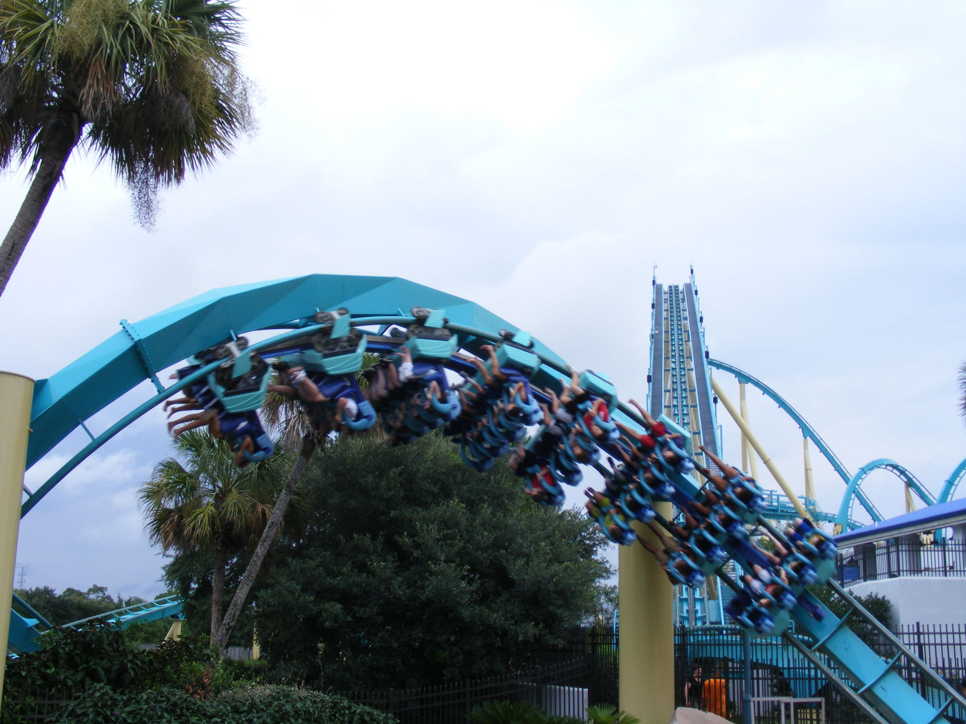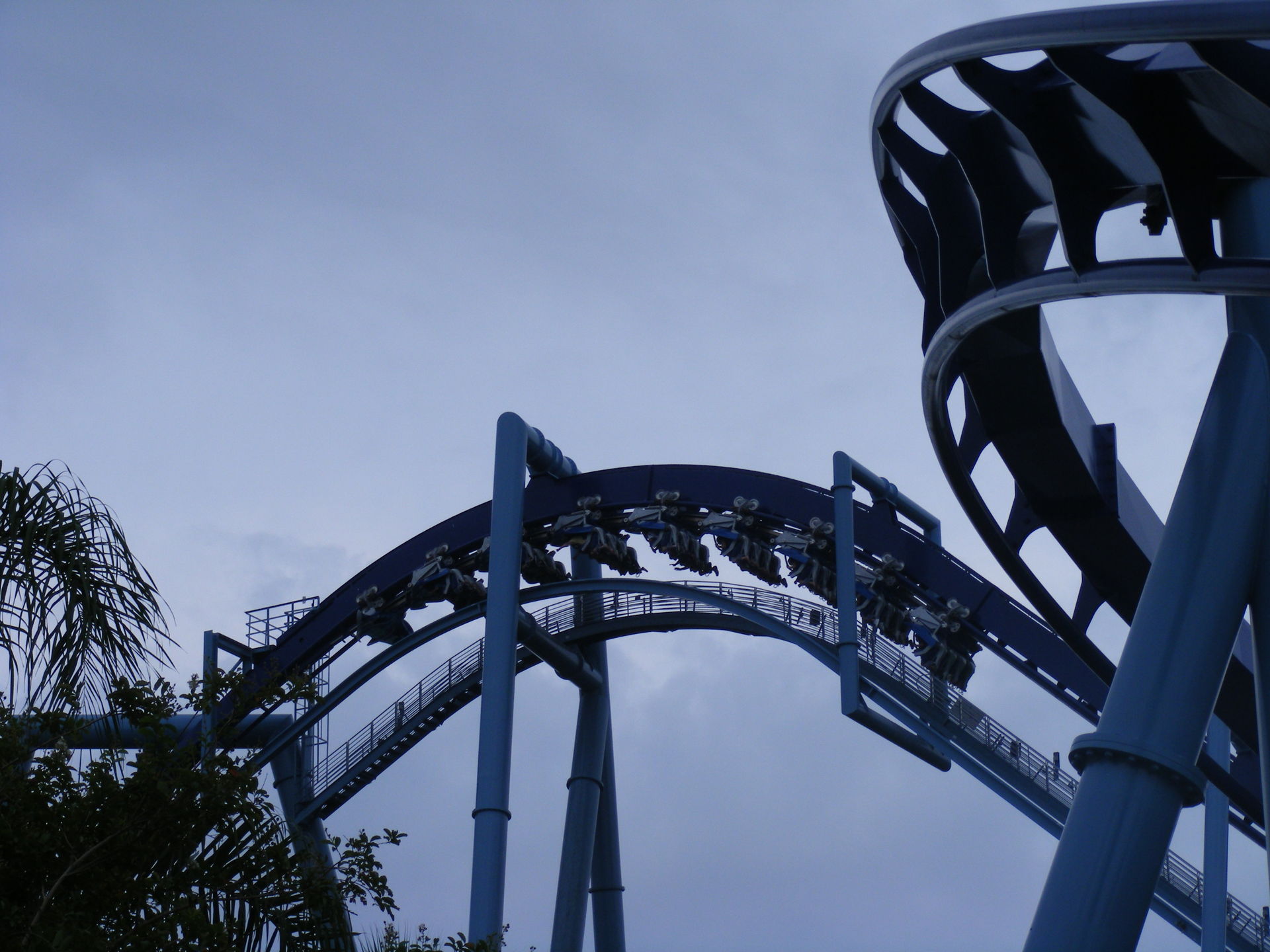 Und wie fuhr sie sich? Interessant. Die Position im Liegen ist irgendwie mal was anderes. Rauf auf den Lift und hinein in den First Drop. Hier spielt meiner Meinung nach diese Gattung von Coastern ihr volles Potenzial aus. Ich hätte mir noch viel mehr hohe, geneigte Abfahrten und gebankte Turns gewünscht, die dieses Gefühl vom Fliegen unterstützen. So ging es hinein in den Pretzel Loop und, alter Schwede, Frontrow rockt dieses Inversionselement mal so richtig! Jederzeit auszuhaltende Kräfte aber das Intensivste, was ich in Florida gefahren bin. Mehr von solchen Inversionen bitte! Der Rest beschränkt sich auf 2 Kurven und Drehungen um die eigene Achse in die Blockbremse. Von dort folgt im Prinzip nur noch eine Fotokurve samt Wassereffekt und eine weitere Inversion, eine Art langgezogener Wingover. Manta fährt sich toll: Butterweich, intensiv im Pretzelloop und das Gefühl unter den Schienen zu liegen ist klasse. Leider kann der Teil nach dem Pretzelloop das hohe Niveau nicht mehr ganz halten. Im Gegenzug könnte man aber auch argumentieren, dass bei Temperaturen von immer noch 35 Grad die Bahn so noch fahrbar ist, anstatt die große G-Keule herauszuholen. Nichtsdestotrotz: Manta schafft es ganz knapp vor Sheikra als beste Bahn des Urlaubes. Wertung: 9,5/10.